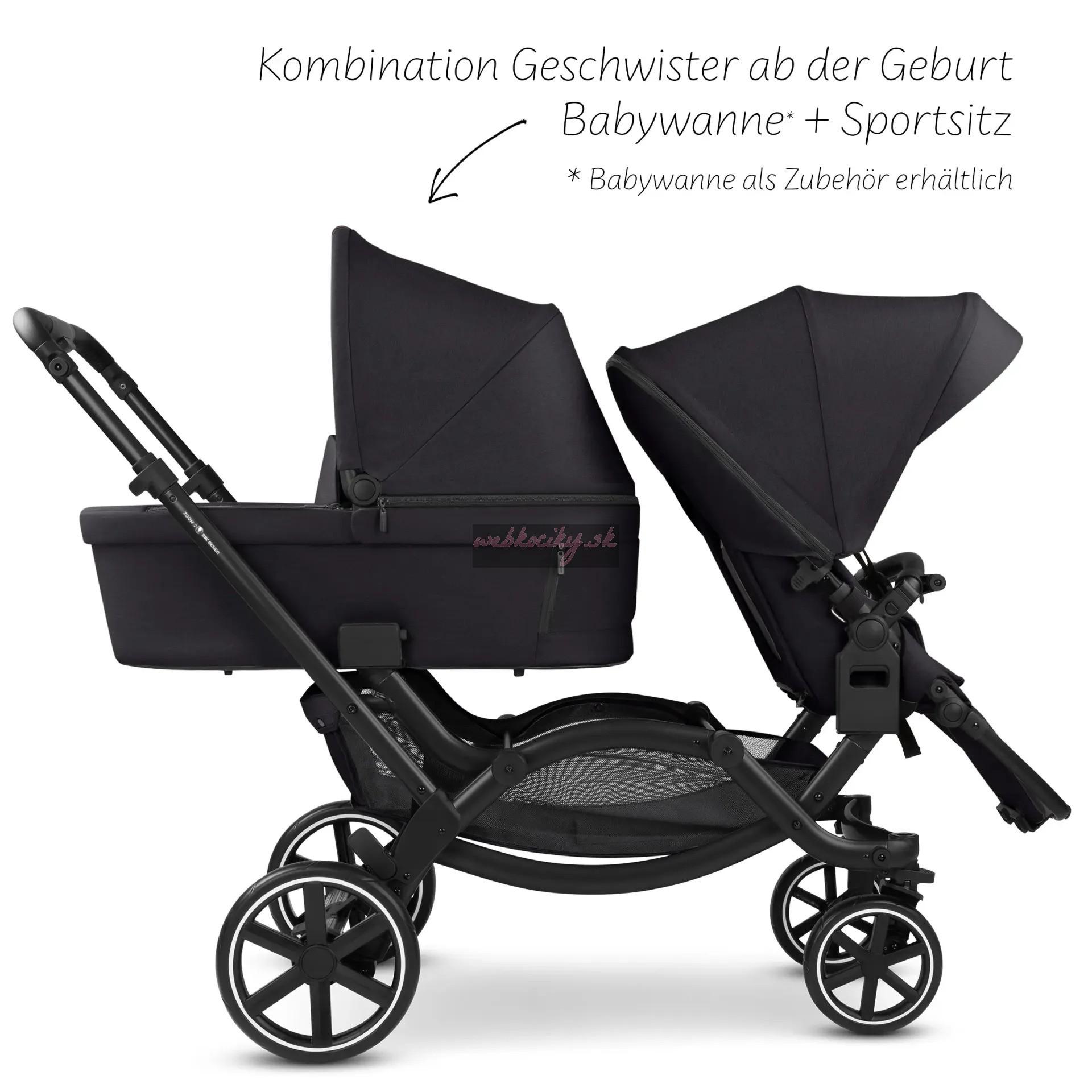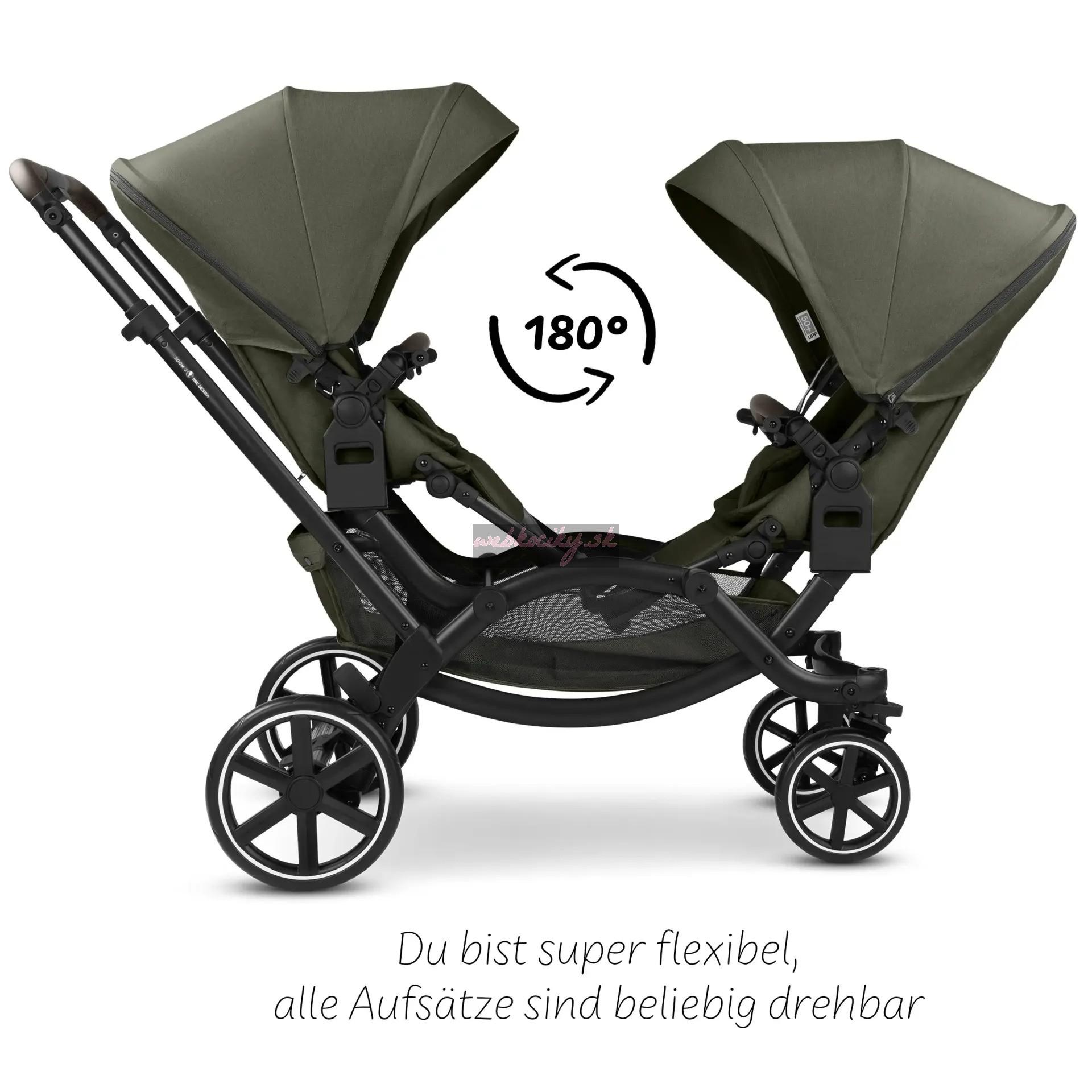 Päťbodový systém pásov HappyBelt® zaisťuje bezpečné uchytenie v sedačke Bezpečné zapínanie pásov je jednoduché vďaka inovatívnemu systému pásov. Veľké uľahčenie v každodennom živote, najmä keď potrebujete čo najrýchlejšie zabezpečiť dve deti v kočíku. Ramenné popruhy, ktoré mierne vyčnievajú z opierky chrbta, a magnetické zapínanie pásov uľahčujú zapínanie, plynulé nastavenie pásov, prístupné spredu, zabezpečuje dokonalé prispôsobenie. Ideálny kočík pre dvoch.