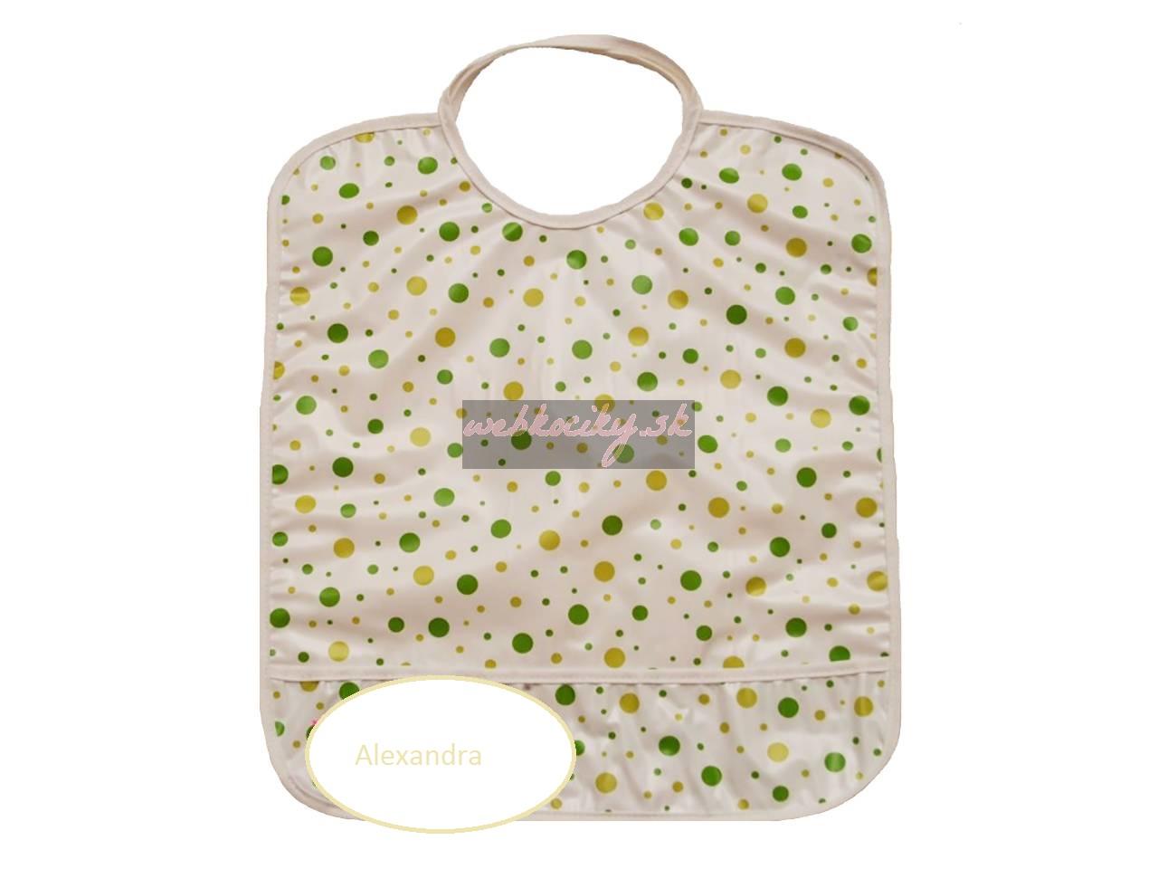 Podbradník ALEXANDRA je pohodlný s veľkým vreckom. Po použití utrite vlhkou handričkou. -