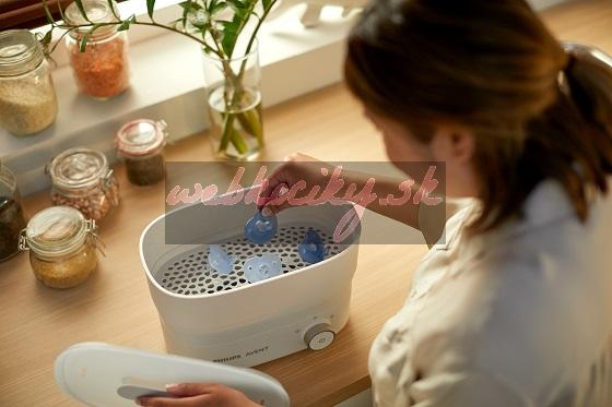 Upozornenie: Sterilizátor / obal na prenášanie, voda a cumlíky môžu byť po 5 minútach chladnutia stále ešte veľmi horúce. Varovanie týkajúce sa sterilizačného obalu: Pred použitím vždy skontrolujte teplotu cumlíkov. Nesprávna výška hladiny vody, výkon mikrovlnnej rúry alebo dĺžka jej použitia môžu viesť k nižšej sterilizácii a môžu poškodiť sterilizátor / obal na prenášanie alebo cumlíky. Používajte iba cumlíky Philips Avent a obal uschovávajte mimo dosahu detí. Cumlík • Pre bezpečnosť vášho dieťaťa • VÝSTRAHA! Pred každým použitím dôkladne skontrolujte. Natiahnite cumlík do všetkých smerov. V prípade akýchkoľvek známok poškodenia alebo opotrebenia ho vyhoďte. Nevkladajte cumlík do vody a následne do mrazničky. Mohlo by dôjsť k oslabeniu cumlíka. Používajte iba držiaky cumlíkov, ktoré boli testované v súlade s normou EN 12586. K cumlíku nepripevňujte žiadne ďalšie pútka ani šnúrky, dieťa by sa nimi mohlo uškrtiť. Cumlík nepriväzujte dieťaťu okolo krku; hrozí nebezpečenstvo uškrtenia. Vždy sa uistite, že vaše dieťa používa správnu veľkosť cumlíka. Cumlíky Philips Avent sa vyrábajú v rôznych veľkostiach podľa vekového rozmedzia. Pred prvým použitím: Cumlík dajte na 5 minút do vriacej vody. Nechajte ho 5 minút vychladnúť, skôr ako ho dáte svojmu dieťaťu. Nechajte vodu zachytenú vnútri cumlíka vychladnúť a potom ju vytlačte von. Tým zaistite potrebnú hygienu. Čistenie a sterilizácia: Pred každým použitím cumlík umyje teplou vodou a jemným mydlom. Na čistenie cumlíka NEPOUŽIVAJTE abrazívne čističe ani agresívne chemikálie/prípravky. Nadmerná kombinácia čistiacich prípravkov môže spôsobiť popraskanie plastových častí. V takom prípade cumlík ihneď vymeňte. Cumlíky sú vhodné pre všetky bežne používané metódy sterilizácie. Skôr ako sa dotknete sterilizovaných cumlíkov, dôkladne očistite povrchy aj svoje ruky. Používanie: Používajte tento výrobok vždy pod dohľadom dospelej osoby. Z bezpečnostných a hygienických dôvodov cumlík po štyroch týždňoch používania vymeňte. NEPANIKÁRTE, ak nie je možné cumlík vybrať z úst. Nie je možného prehltnúť, je navrhnutý tak, aby bolo možné zvládnuť aj tieto situácie. Opatrne a čo najjemnejšieho vyberte z úst. Neponárajte cumlík do sladkých látok alebo liekov, u dieťaťa by mohlo dôjsť ku vzniku zubného kazu. Skladovanie: Cumlík uschovávajte v sterilizátore / obale na prenášanie alebo v suchej krytej nádobe.