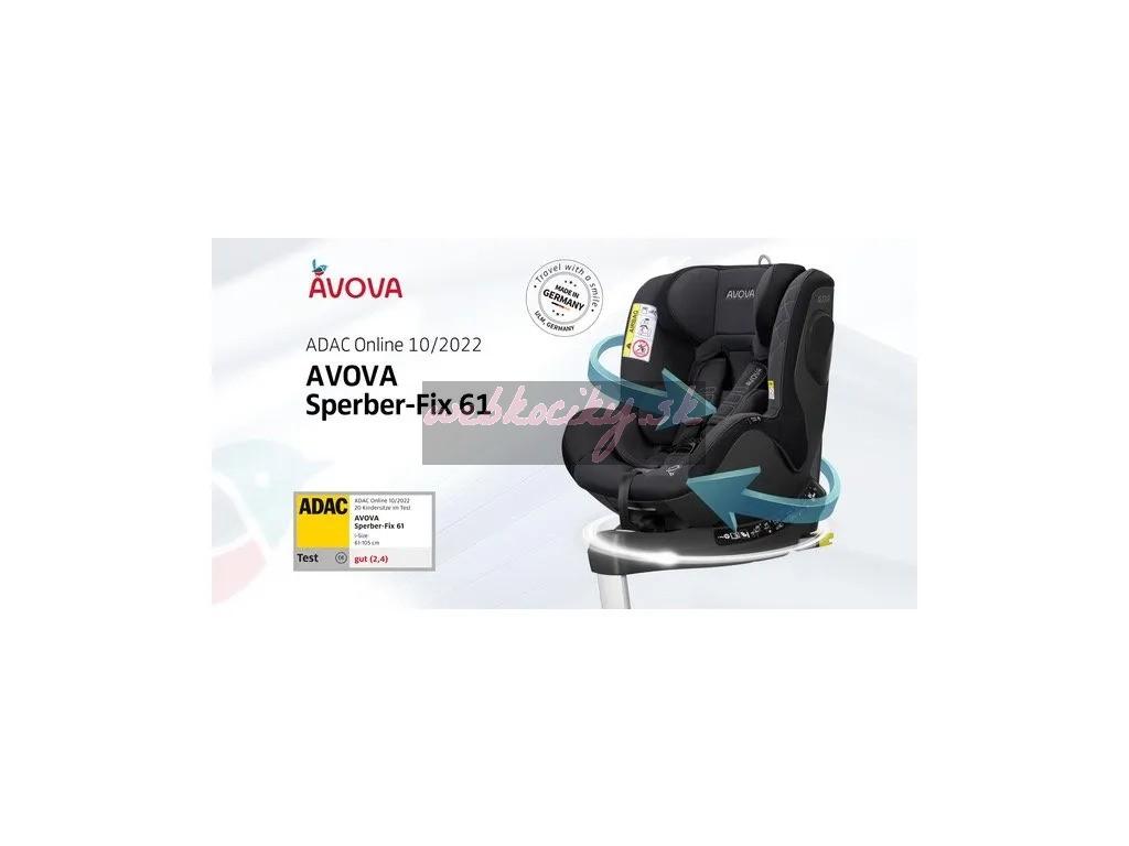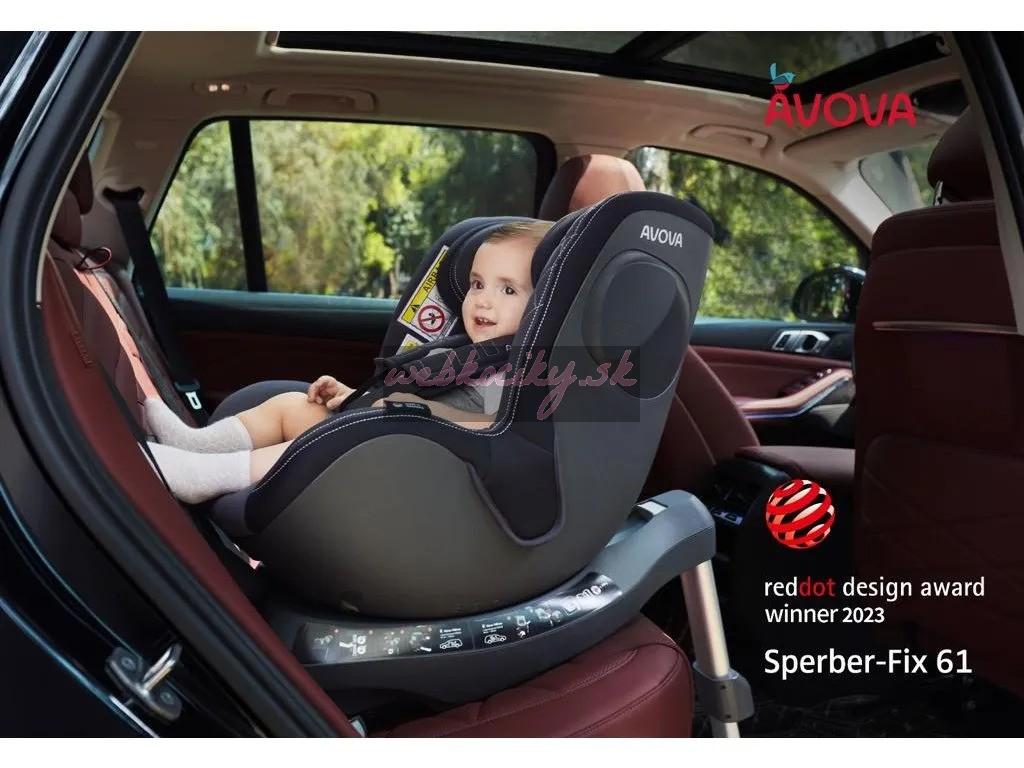 Nemecká otočná autosedačka AVOVA SPERBER-FIX 61 je skutočne všestranná. Má všetko, čo od bezpečnej, prémiovej detskej autosedačky s ISOFIXom očakávate. Je schválená podľa najnovších bezpečnostných smerníc UN ECE R-129/3 s i-Size a taktiež mimoriadne praktická vďaka svojej rotačnej funkcii. SPERBER-FIX 61 je vhodný od 61 do 105 cm, teda pre bábätká a malé deti. To zodpovedá hmotnosti do 20 kg (resp. celkovej skupine 0+, 1). Víťaz Reddot Design Award 2023