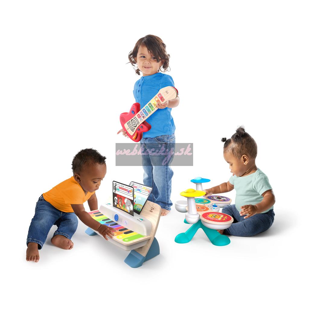 Chcete naučiť svoje deti hrať sa spolu v harmónii? Together in Tune Guitar™ je drevená hudobná hračka, ktorá im umožňuje džemovať samostatne alebo spolu so súrodencami a priateľmi. Bezdrôtovo sa pripája k ostatným nástrojom Together in Tune™ v dosahu a automaticky sa harmonizuje, čím vytvára nádhernú hudbu, ktorú si mama a otec užijú rovnako ako ich dojčatá a batoľatá. Bezpečné bezdrôtové spojenie medzi prístrojmi funguje ako vysielačka cez rádiové signály. Táto detská gitara v spolupráci medzi Hape™ a Baby Einstein™ podporuje rozvoj jemných motorických schopností. Technológia Magic Touch™ spája trvanlivosť a hodnotu klasickej drevenej hračky s najnovšou technológiou hudobných hračiek súčasnosti. Dokonca aj najjemnejšie poklepanie na celú oktávu farebných maľovaných pražcov vydáva skutočné gitarové zvuky. Táto detská gitara Baby Einstein, ktorá obsahuje 4 režimy (režim objavuj; režim predvádzania; režim hrania; režim kapely) a 10 populárnych melódií, dáva dieťaťu slobodu vytvárať si vlastné beaty, vrstviť riffy a jednoduché zvuky, rozhýbať sa a ovládať svoje obľúbené piesne. Ak hľadáte hudobnú hračku ako darček na oslavu bábätka alebo na prvé narodeniny, toto je tá správna. Vďaka drevenému dizajnu bez gombíkov sa táto hračka pre batoľatá mimoriadne ľahko čistí. Zahŕňa ovládanie hlasitosti Vypnúť/Nízka/Vysoká. Vhodné pre batoľatá a deti od 6 mesiacov.