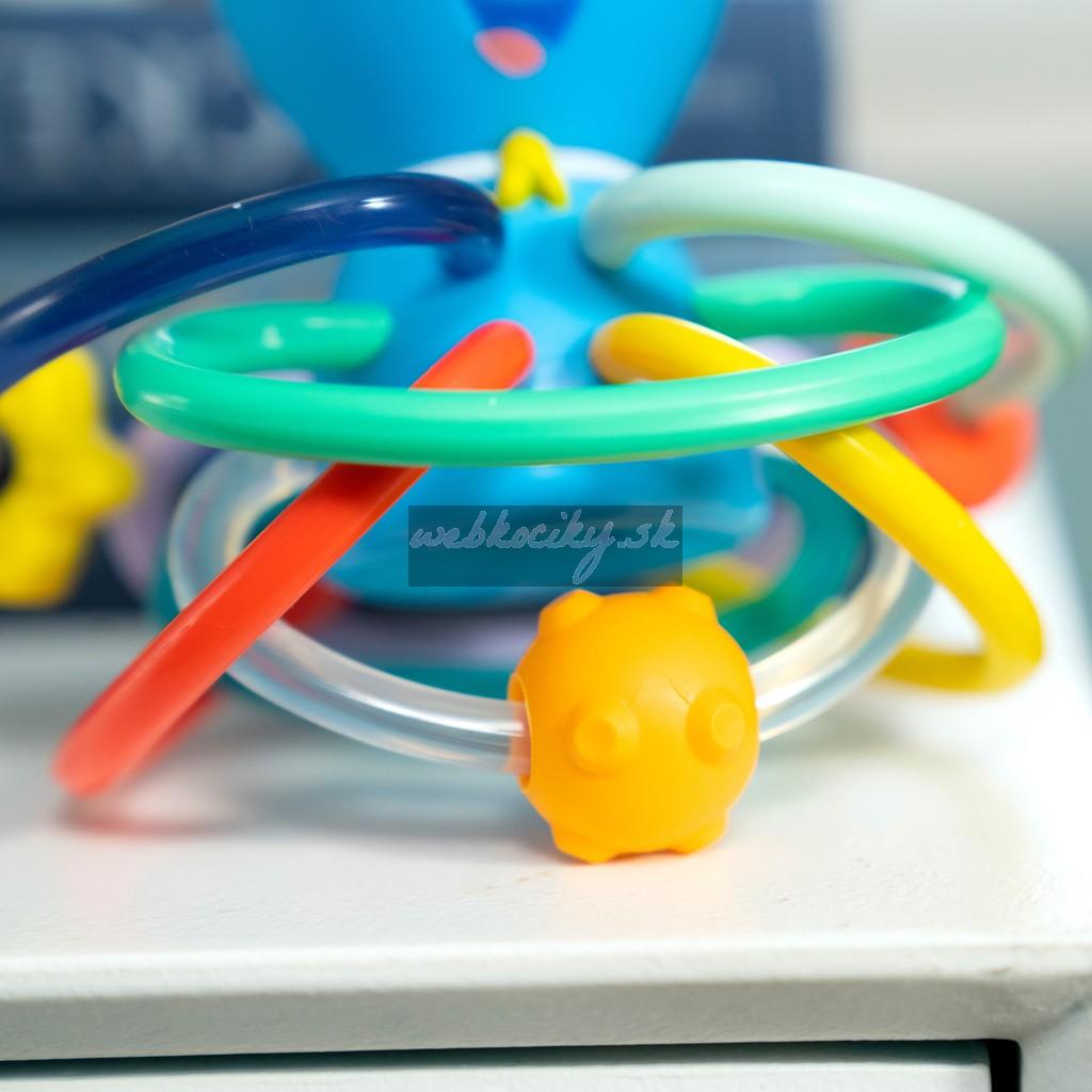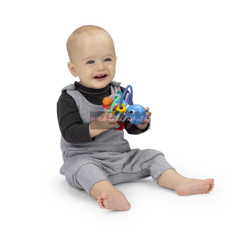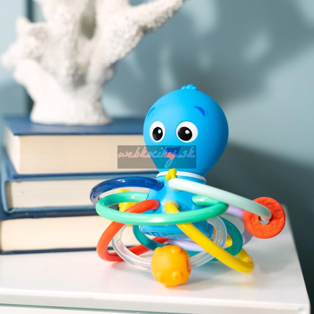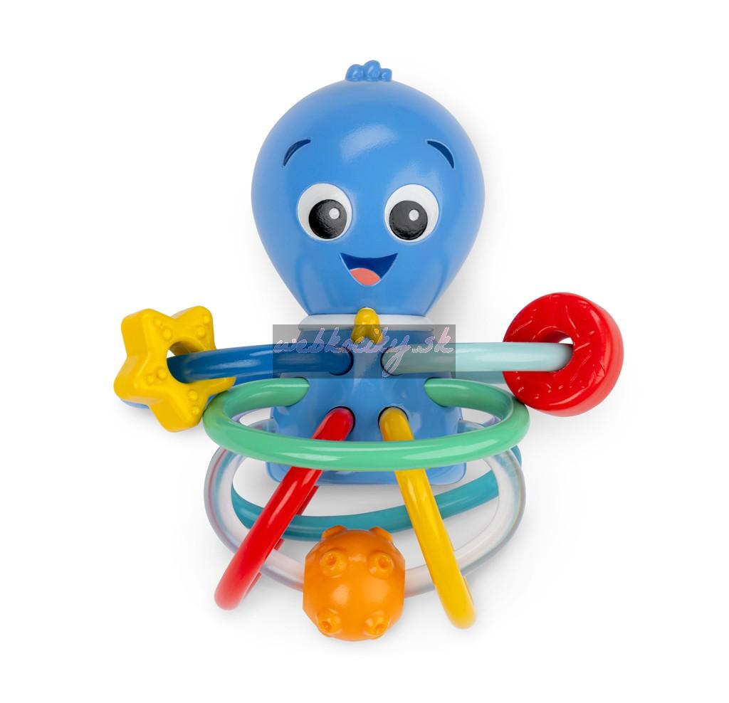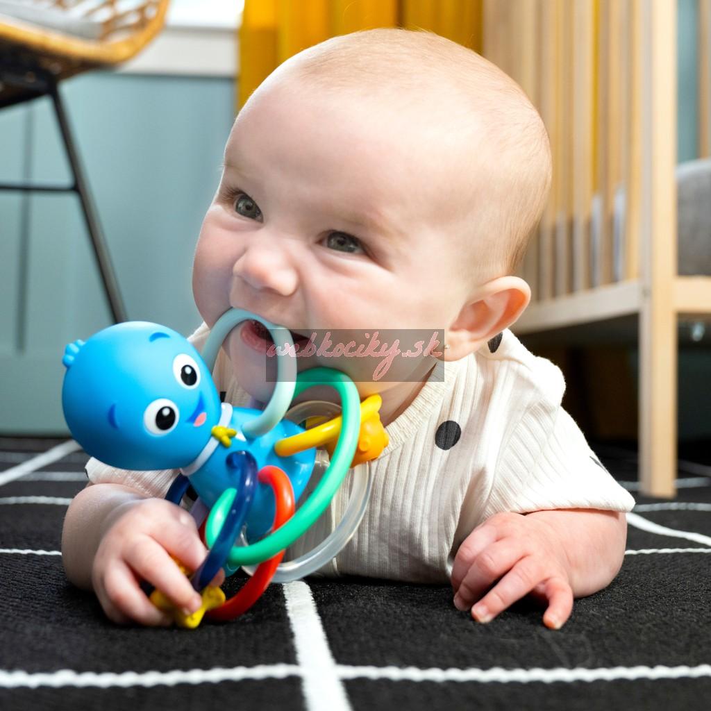 Hračka na hryzenie a hrkálka Baby Einstein Ocean Explorers pomáha upokojiť boľavé ďasná a stimulovať zmysly dieťaťa vďaka rôznym textúram, jasným farbám a skrytej hrkálke. Toto farebné hryzátko podporuje rozpoznávanie farieb a skrytá hrkálka odmeňuje zvedavosť dieťaťa pri každom zatrasení.