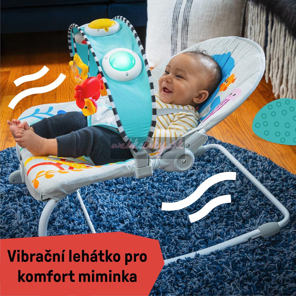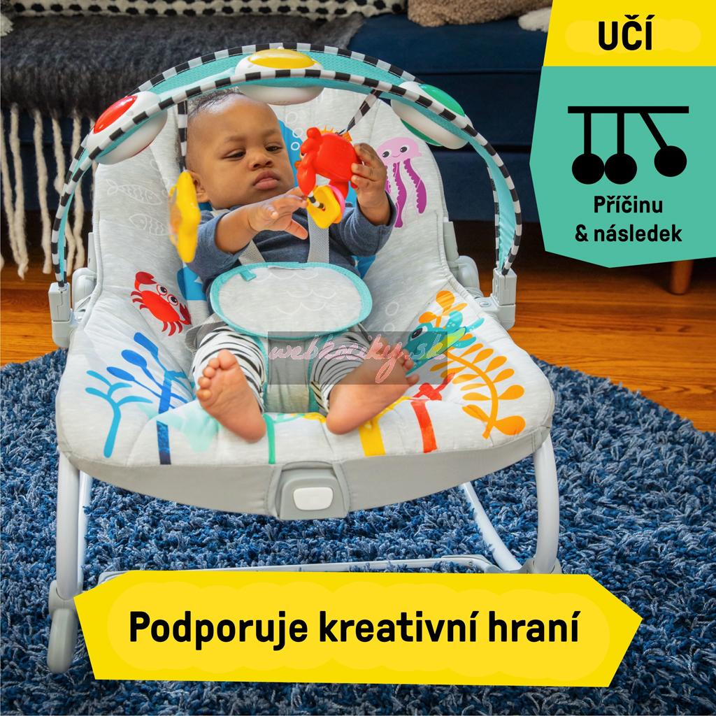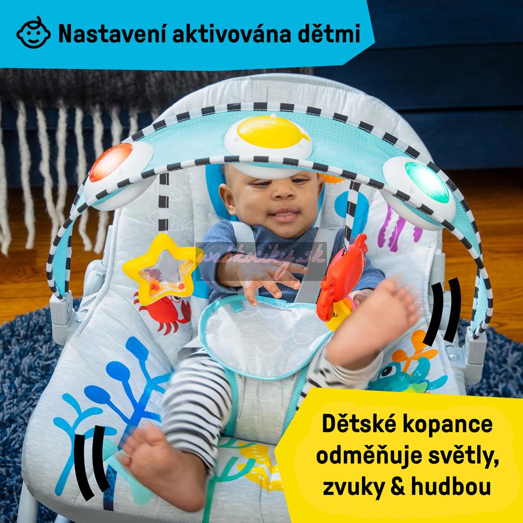 Baby-Activated Setting odmeňuje detské kopance tanečnými svetielkami, viac ako 25 melódiami a zvukmi. Rodičom aktivované nastavenie zabaví dieťatko 30+ minútami hravej hudby a jemných svetiel. Bábätko sa bude rado hýbať a siahať po 2 visiacich hračkách alebo si užívať relaxačné vibrácie. Ako dieťatko rastie, detská hojdačka sa premení na útulné sedadlo a opäť na hojdačku pre batoľatá. Odnímateľná podložka sedadla sa ľahko čistí. Maximálna hmotnosť na použitie je 18 kg. Nie je určené na spánok dojčiat.