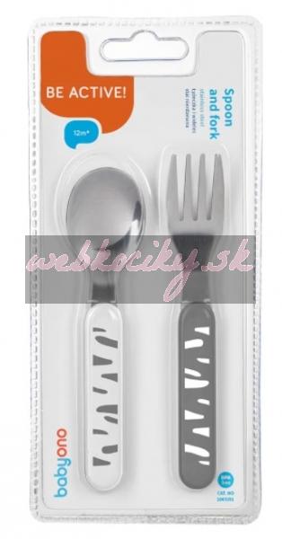 Nerezová lyžička a vidlička so zaoblenými koncami a plastovou rukoväťou s obrázkami.