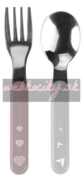Nerezová lyžička a vidlička so zaoblenými koncami a plastovou rukoväťou s obrázkami.