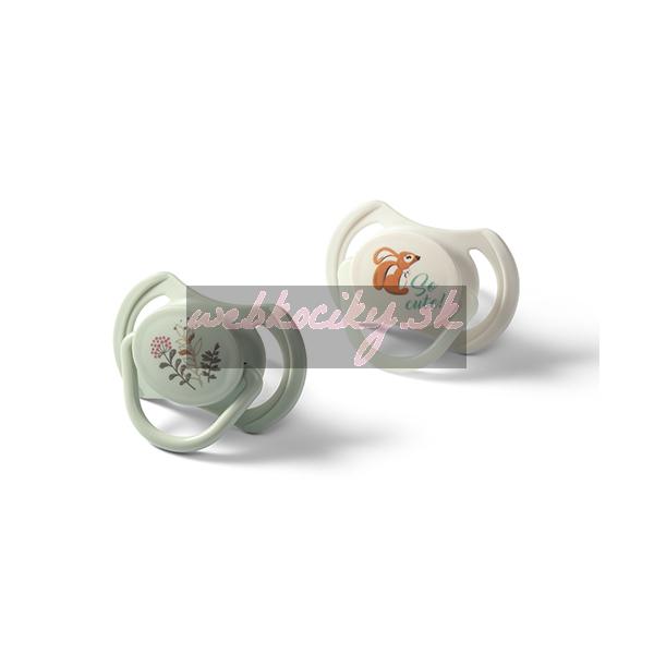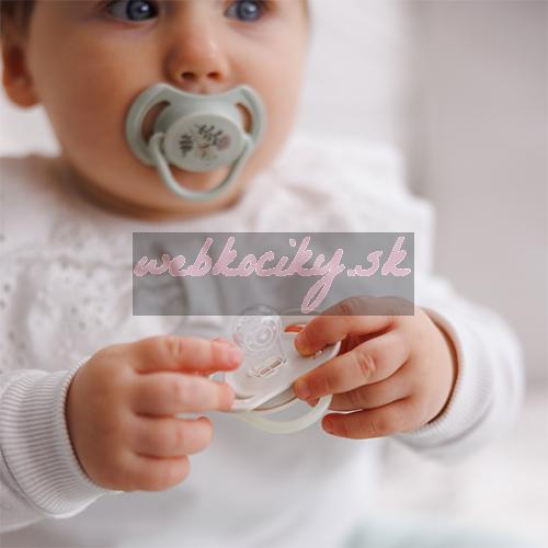 Symetrický silikónový cumlík upokojí vaše bábätko a dopraje vám chvíľku oddychu. Sploštená špička po oboch stranách sa dokonale prispôsobí ústam dieťaťa a podporuje správny vývoj chrupu a polohu jazyka. Profilovaný štítik s otvormi umožňuje voľné dýchanie nosom a zabezpečuje cirkuláciu vzduchu okolo úst. Náustok je vyrobený z hypoalergénneho, bezpečného silikónu, ktorý je odolný voči poškodeniu a neobsahuje BPA. Súprava obsahuje 2 cumlíky pre deti vo veku 6-18 mesiacov – jeden na denné použitie a jeden so svietiacou rúčkou, ideálny na nočné upokojenie.
