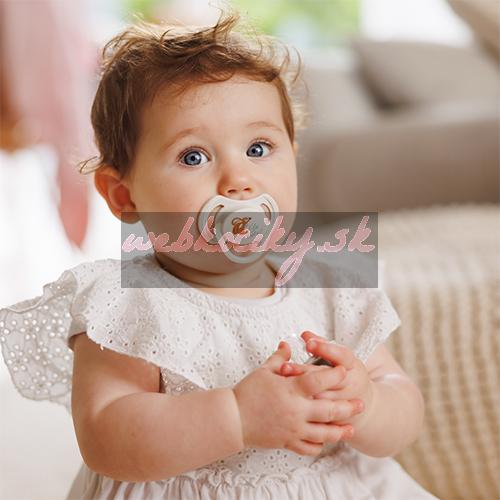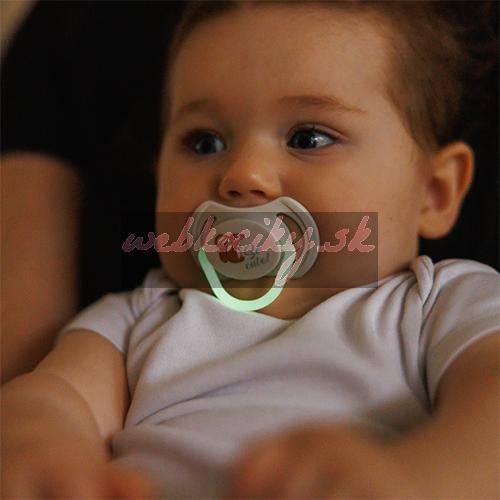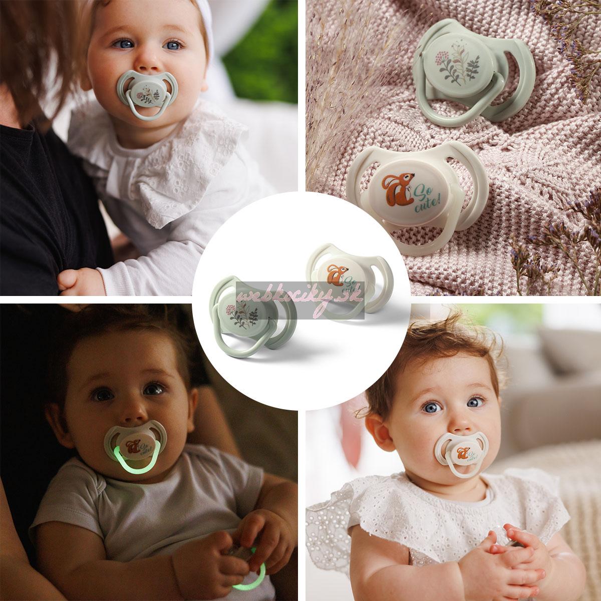 - Denný a nočný cumlík – v balení nájdete jeden klasický a jeden so svietiacou rúčkou, pripravený upokojiť dieťa aj v noci