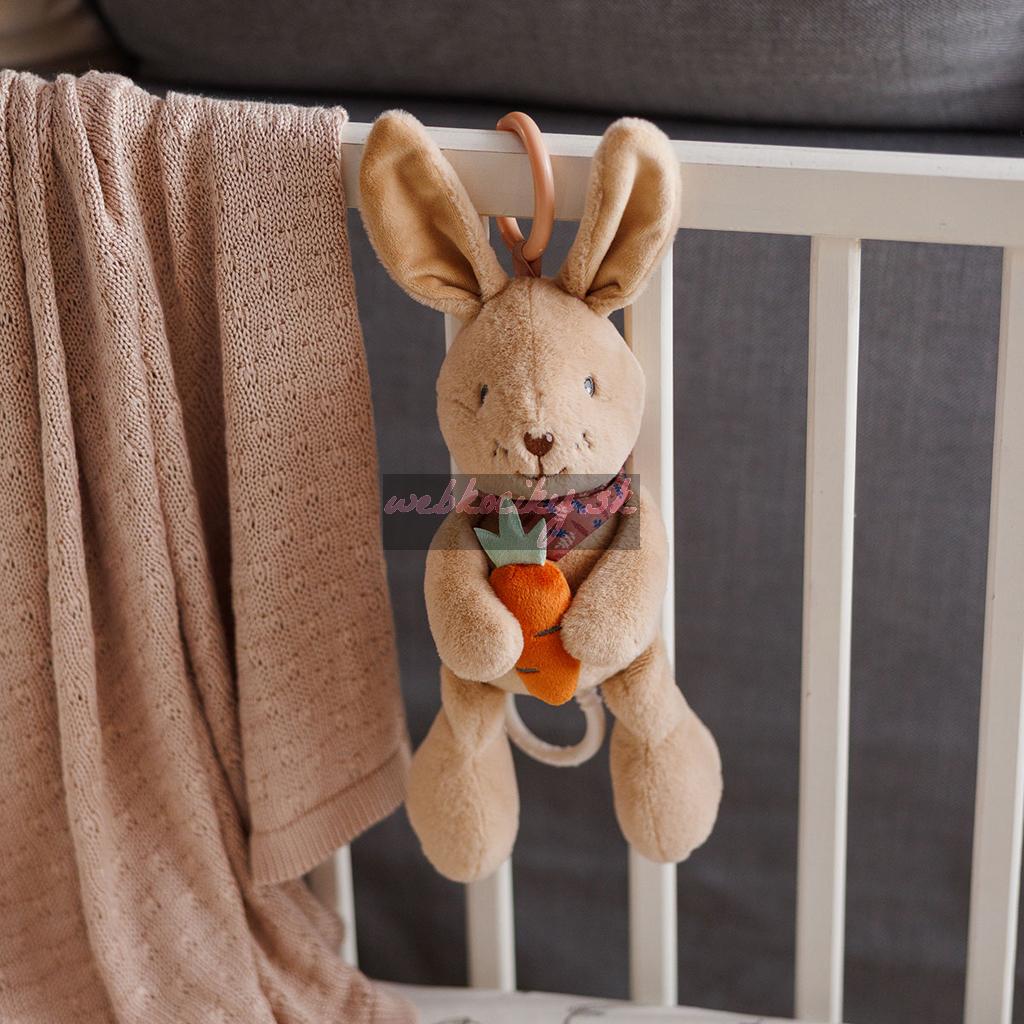 Tento usmievavý zajačik je mäkká, maznavá hračka s hudobnou skrinkou ktorá zaujme od prvých dní života vášho bábätka. Baví, upokojuje a rozvíja jeho zmysly. Krílíček hrá krásnu, upokojujúcu melódiu, ktorá dieťa upokojí a pomôže mu zaspať po náročnom dni. Farebné prvky priťahujú pohľad, dlhé uši a nožičky povzbudzujú k uchopeniu a mäkký materiál stimuluje hmat. Vaše dieťa bude dychtivo naťahovať ručičky a precvičovať si obratnosť. Táto hračka je vybavená univerzálnym držiakom. Môžete ju pripevniť na postieľku, kočík alebo autosedačku a sprevádzať tak vaše dieťa doma aj na prechádzkach.
