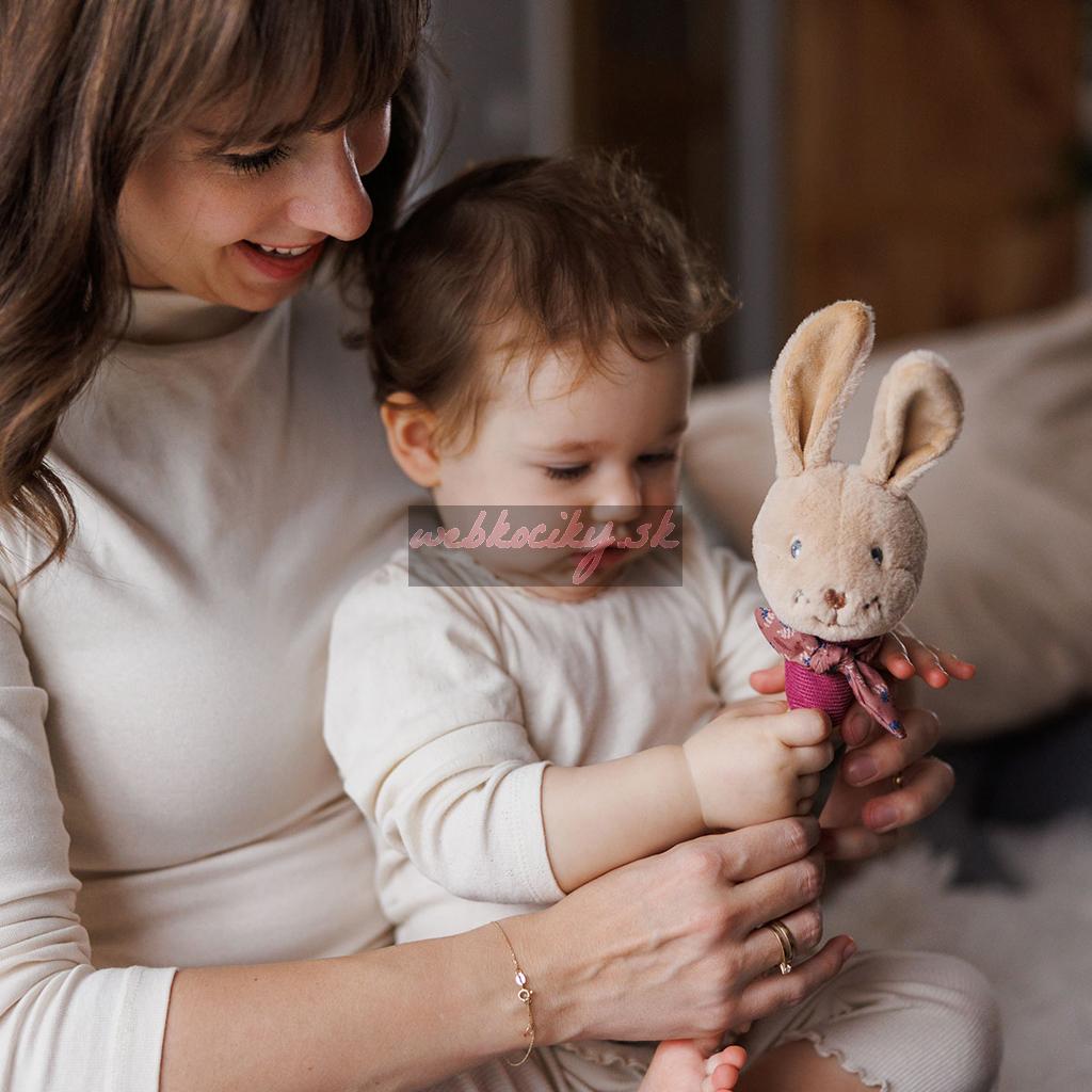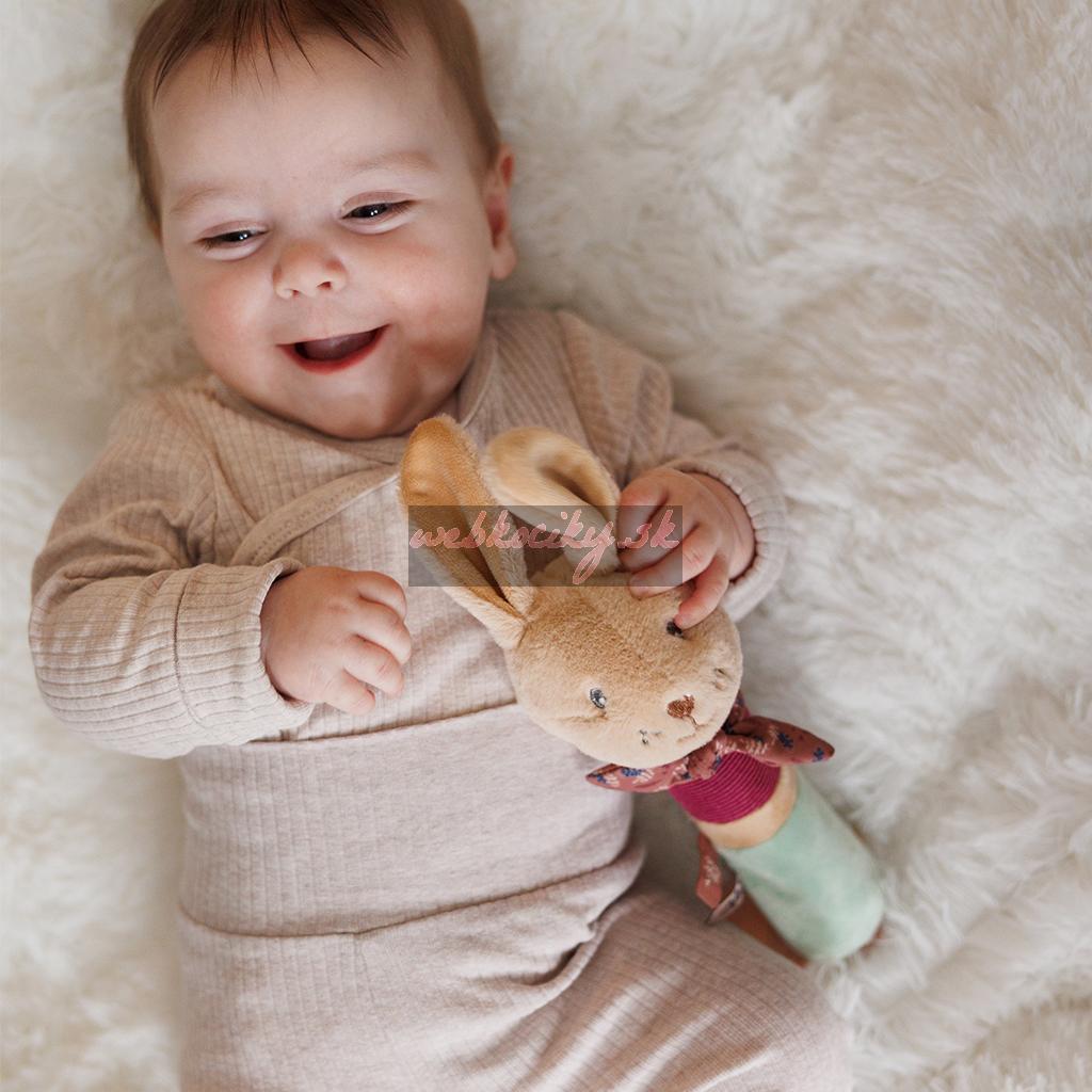 Rôzne farby stimulujú zrak, zatiaľ čo dlhé uši, uzol a stužky podporujú hmatovú spätnú väzbu. Malé ručičky môžu uchopovať a preskúmavať, čím rozvíjajú jemnú motoriku doma aj na prechádzkach.