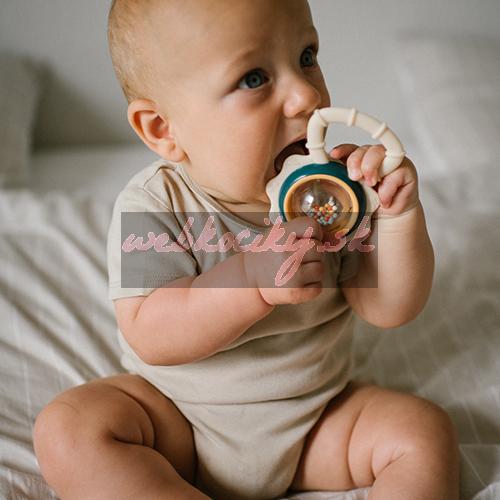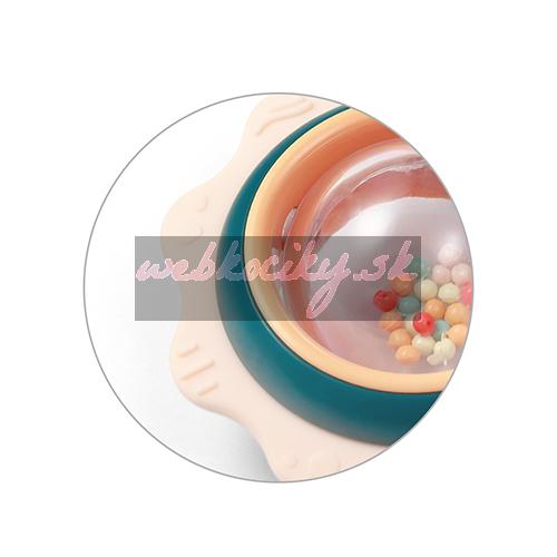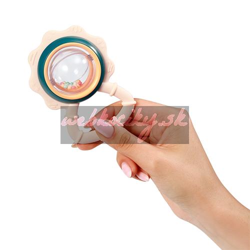 - Pri trasení hrkálka vydáva jemné zvuky, ktoré priťahujú pozornosť bábätka a rozvíjajú jeho sluch.
