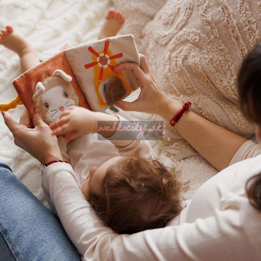 - Zavesenie: Kniha má praktické pútko na zavesenie, takže ju možno ľahko zavesiť na postieľku, kočík alebo autosedačku. Zaujme vaše dieťa doma, na prechádzkach aj na cestách.