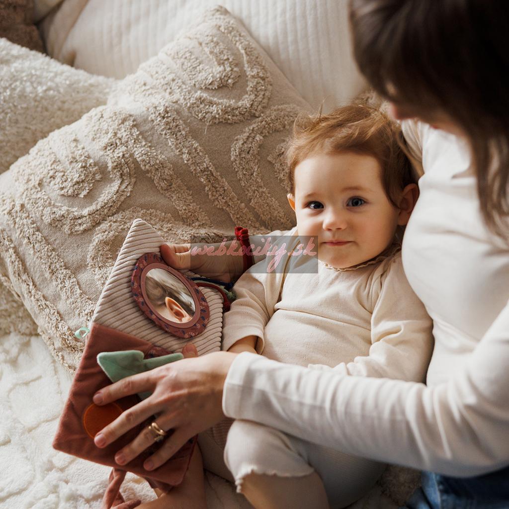 - Zrkadlo: Kniha obsahuje bezpečné a vizuálne pútavé zrkadlo. Podporuje naťahovanie a dotýkanie sa, rozvíja koordináciu ruka-oko. Vaše dieťa bude fascinované svojim vlastným odrazom.