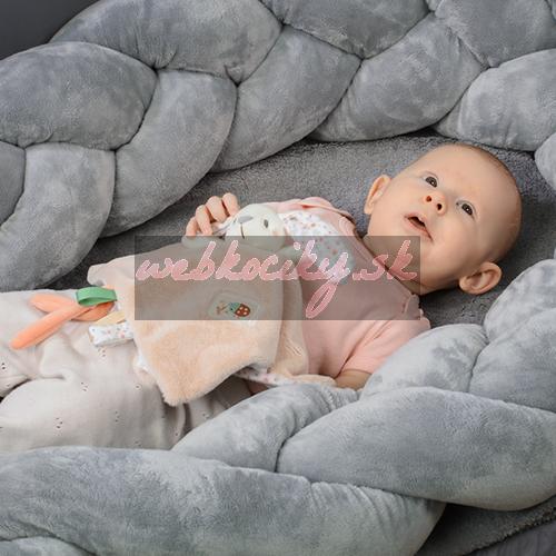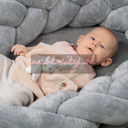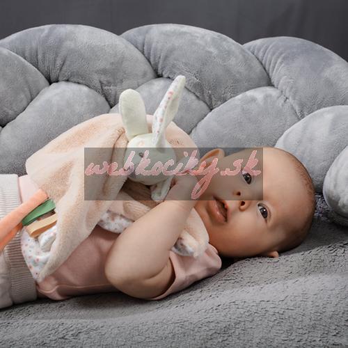 Dečka a hračka na maznanie 2v1 má však aj edukačný aspekt. Pomáha rozvíjať zmysly dieťatka od prvých dní života. Textúra minky bavlneného materiálu s malými 3D bodkami stimuluje hmat, rovnako ako mäkké uzlíky alebo šnúrky, ktoré povzbudzujú dieťatko k precvičovaniu úchopu. Tkanina je priedušná a jemná.