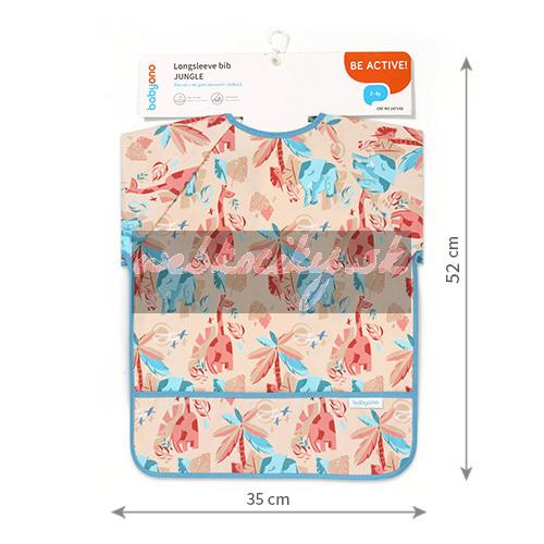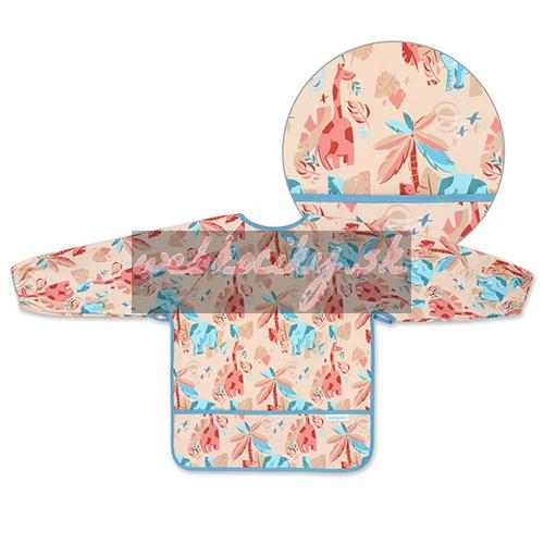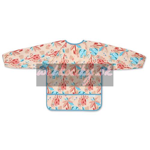 Podbradník s dlhým rukávom je šikovný pomocník, ktorý ochráni oblečenie Vášho bábätka. Počas jedenia zaisťuje prednú časť oblečenia aj rukávy, ktoré sa zvyknú zašpiniť. Vďaka pružným gumičkám dobre priľne k malým ručičkám bábätka. Podbradník s rukávmi má aj praktické vrecko na omrvinky, ktoré zachytáva zvyšky jedla. Zástera s rukávmi je vodeodolná a ľahko sa čistí, takže sa osvedčí, keď sa dieťatko učí jesť samo. Zapínanie podbradníka môžete ľubovoľne prispôsobiť veľkosti krku bábätka.