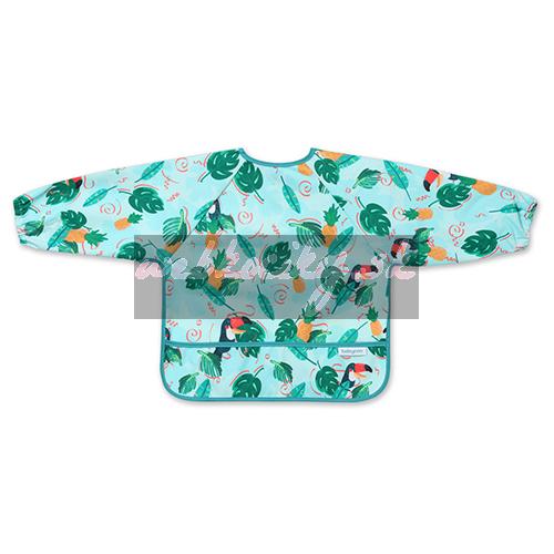 Podbradník s dlhým rukávom je šikovný pomocník, ktorý ochráni oblečenie Vášho bábätka. Počas jedenia zaisťuje prednú časť oblečenia aj rukávy, ktoré sa zvyknú zašpiniť. Vďaka pružným gumičkám dobre priľne k malým ručičkám bábätka. Podbradník s rukávmi má aj praktické vrecko na omrvinky, ktoré zachytáva zvyšky jedla. Zástera s rukávmi je vodeodolná a ľahko sa čistí, takže sa osvedčí, keď sa dieťatko učí jesť samo. Zapínanie podbradníka môžete ľubovoľne prispôsobiť veľkosti krku bábätka.