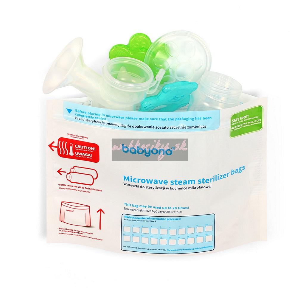 Sterilizačné vrecká do mikrovlnnej rúry sú jednoduchým, rýchlym a bezpečným spôsobom sterilizácie fliaš, cumlíkov, ochrán bradaviek a ďalších výrobkov pre dojčatá. Je to výrobok nahrádzajúci tradičný sterilizátor. Sterilizácia trvá iba 1,5 minúty a prebieha v troch jednoduchých fázach. Vodná para, ktorá sa v sáčku vytvára počas sterilizačného procesu, likviduje až 99,9% baktérií a choroboplodných zárodkov. Každé vrecko možno použiť až 20 krát. Výrobok je vyrobený z trvanlivých a bezpečných materiálov, úplne bez obsahu bisfenolu A, je bezpečný, spoľahlivý a funkčný.
