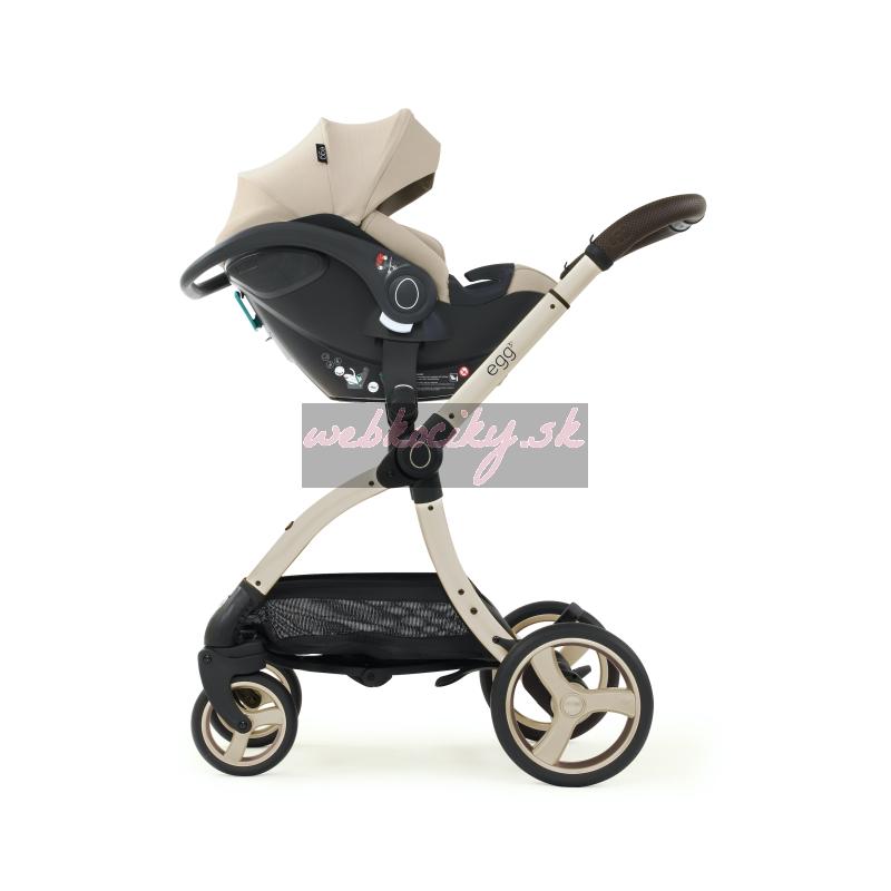 - Nasadenie autosedačky egg Shell do multi adaptérov na podvozku kočíka egg®, egg2® a egg3® je rýchle a jednoduché a zvládnete to jednou rukou: rukoväť autosedačky nastavíte do kolmej polohy, autosedačku nasadíte na adaptéry a sklopením rukoväti dozadu dôjde k uzamknutiu poistky autosedačky v ráme. Spätným pohybom rukoväte do kolmej polohy poistku odistíte a autosedačku jedným pohybom odstránite z podvozku