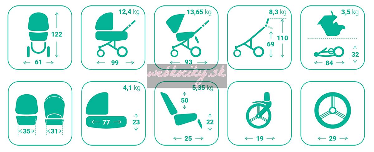 Okrem základného príslušenstva, ako je držiak na pohár, pláštenka alebo moskytiéra, súprava obsahuje aj funkčný držiak telefónu, ktorý je možné zavesiť na rám. Súčasťou sady sú aj poťahy na rám a čalúnenie, ktoré poskytujú výbornú ochranu pred poškriabaním pri preprave a skladovaní kočíka. Rozmery: