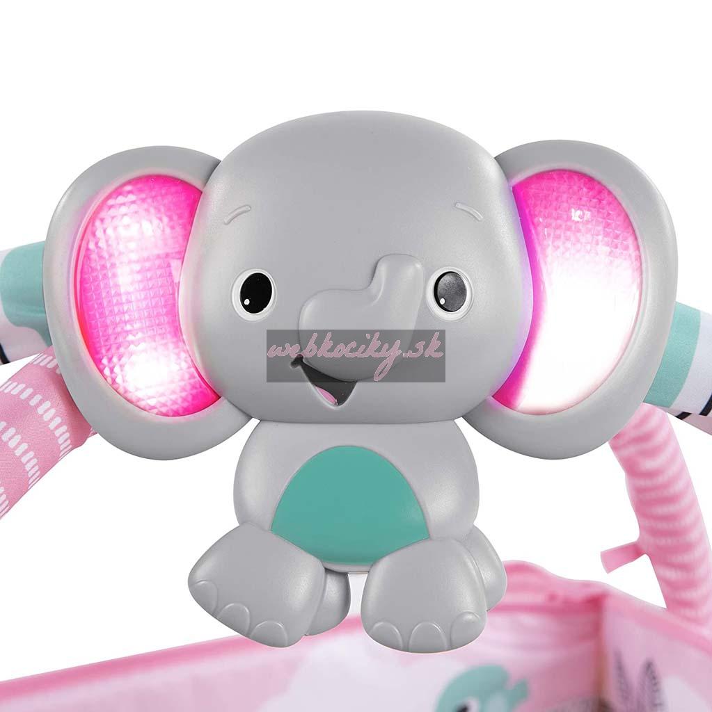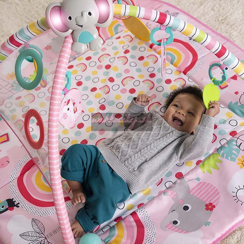 Keď dieťa vyrastie, môže si samo precvičovať motorické zručnosti púšťaním loptičiek zo striešky alebo kotúľaním či podávaním loptičiek sem a tam! Pre menšie bábätká sa hracia deka rozloží celá, kde dieťatko môže stráviť čas na chrbátiku a hrať sa s hračkami na hrazdičke alebo sa s nimi zahrať na brušku pri podpore s vankúšikom, ktorý je tiež súčasťou. Veselý sloník svieti a hrá hudbu viac ako 20 minút a samozrejme si ho môžete zobrať so sebou aj na cesty.