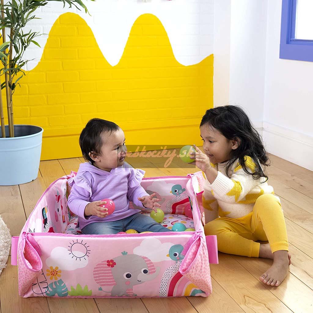 Plyšové bočnice deky môžete nastaviť smerom nahor a naplniť tak hernú telocvičňu 40 farebnými loptičkami, čím poslúži ako ohrádka aby sa nerozkotúľali po celej izbe. Mamička a otecko sa môžu tiež zapojiť do akcie púšťaním loptičiek cez otvor v sieťovanej strieške.