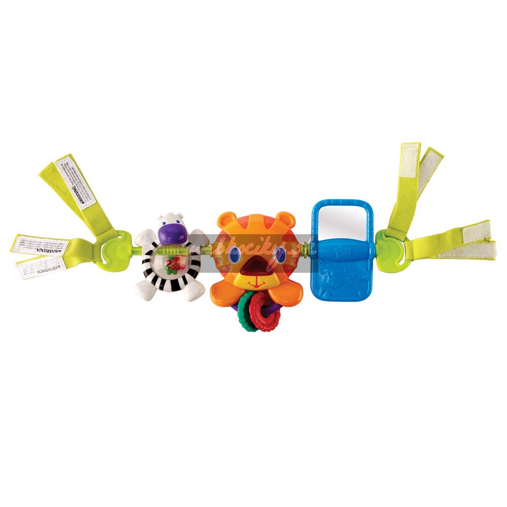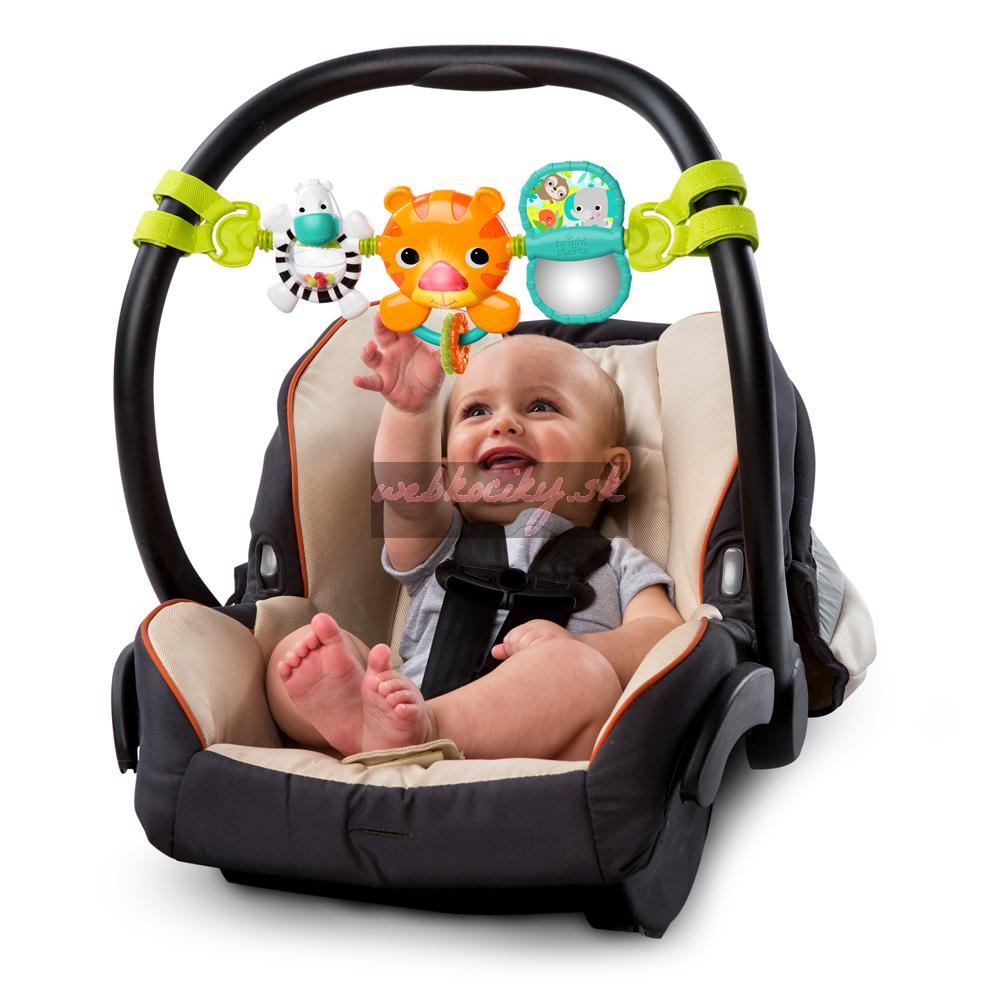 Hračka do kočíka je vhodná pre deti od narodenia. Nos tigra sa rozsvieti a zahrá 4 melódie, keď ho dieťa stlačí, zebra sa otáča dookola a vo vnútri nej hrkajú farebné korálky av otočnom zrkadle sa môže dieťa samo vidieť. Hračku možno ľahko uchytiť na väčšinu kočíkov alebo autosedačiek.