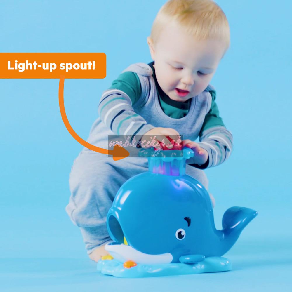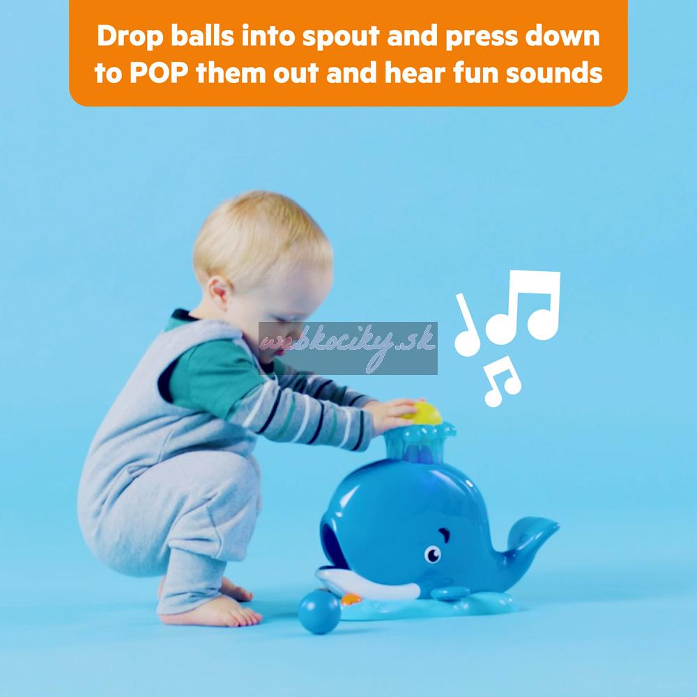 Stačí vložiť loptičky do otvoru na hlave veľryby, zatlačiť a zábava sa môže začať. Rozsvietia sa zábavné svetlá a zvuky, loptičky vyskakujú z úst veľryby, čím podporujú opakované hranie a pohyb dieťatka. Deti milujú naháňanie loptičiek a nekonečná zábava je tu. Súčasťou balenia sú 3 farebné loptičky.