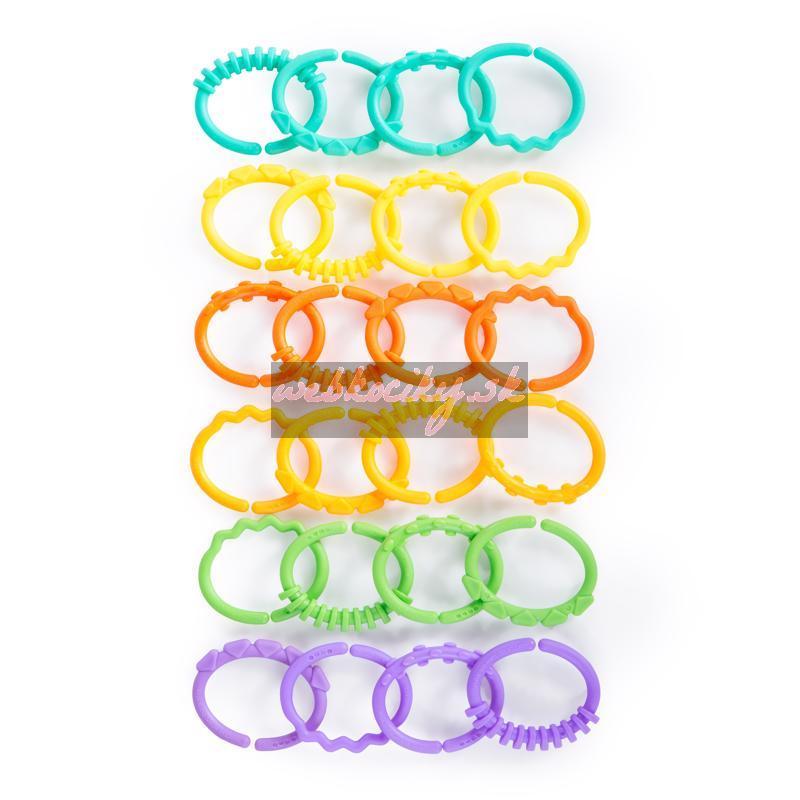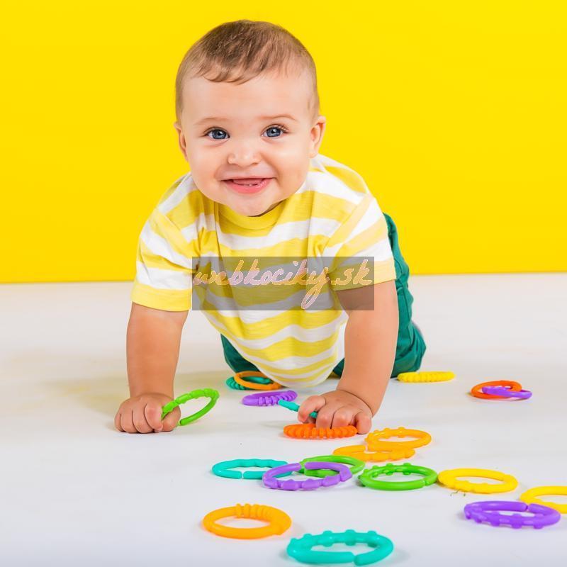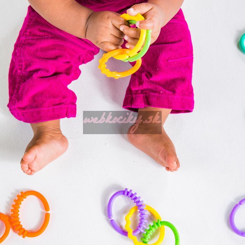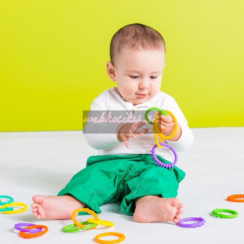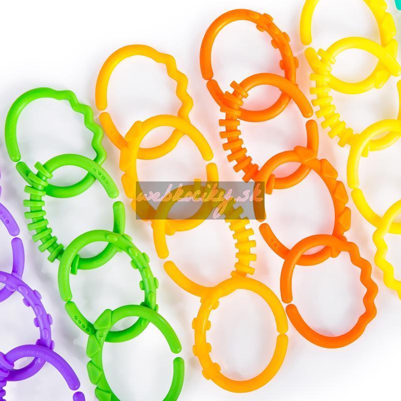 Ideálna pre pripájanie hračiek takmer kamkoľvek! Veselý reťaz, ktorý možno spájať a zase rozopjovat je u detí veľmi obľúbený. Rozvíja jemnú detskú motoriku. Možno využiť aj na iné účely napr. na zavesenie na kočík, na hrazdičku, jendotlivé články reťaze možno využiť aj samostatne na zavesenie ďalších hračiek. 18 zábavných očiek s textúrou povrchu pre rozvoj hmatu. Modelovanie na 6 očkách vytvára mäkký povrch, vhodný na hryzenie. Vďaka znovupoužiteľnej plastovej taške budú očká usporiadaná, navyše je vhodná na cestovanie.</p>