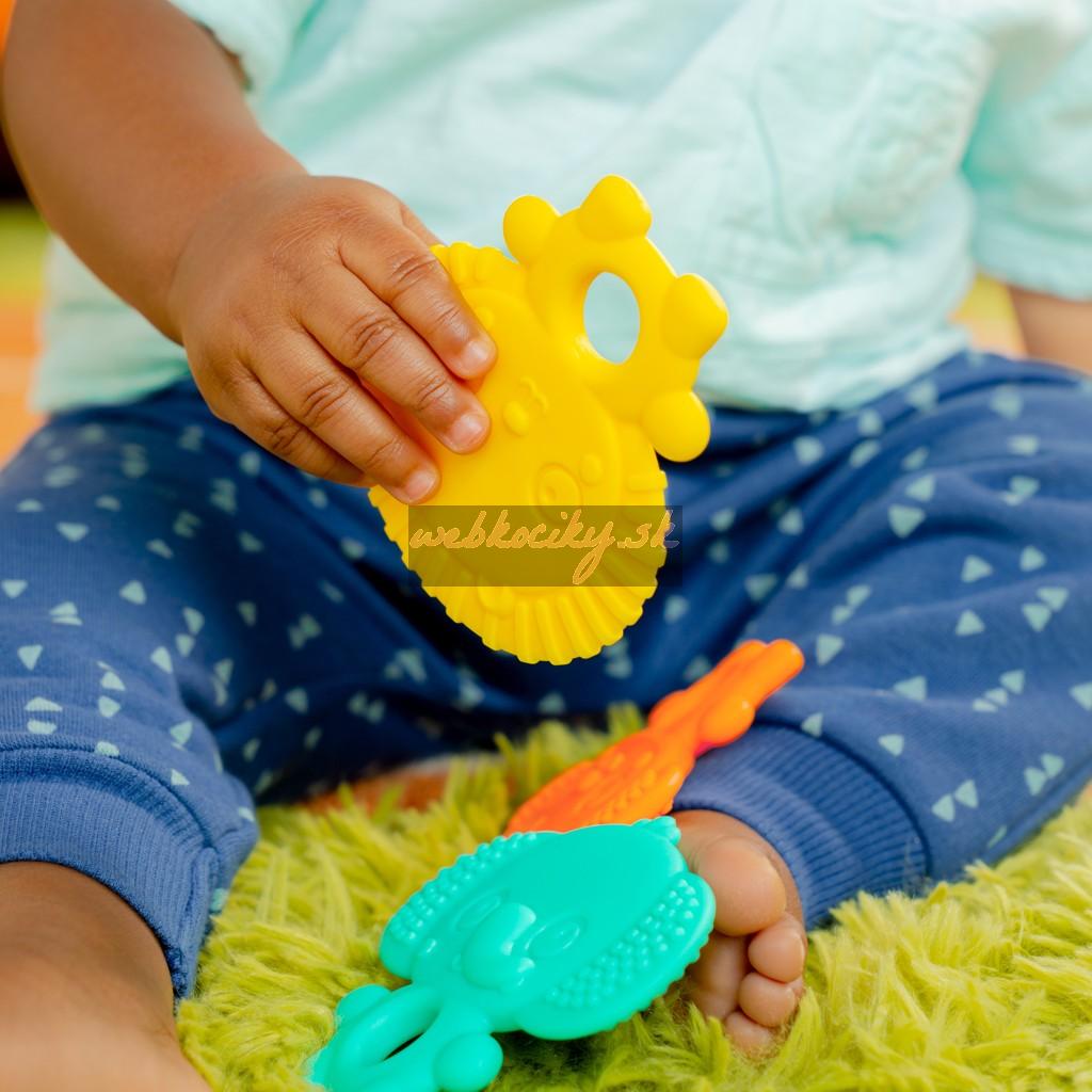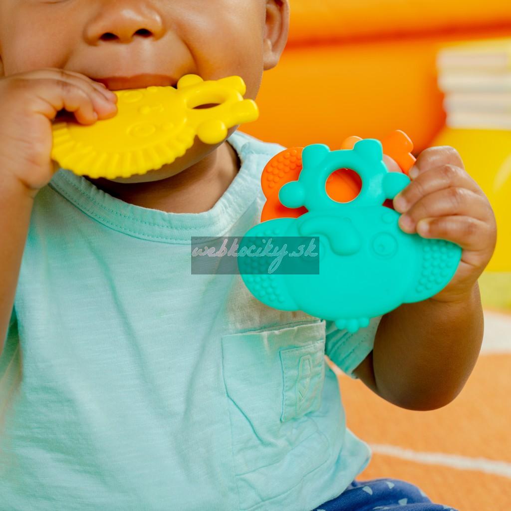 Kto hovorí, že prerezávanie zúbkov nemôže byť zábava?!Predstavujeme vám tri textúrované hryzačky, ktoré pomáhajú upokojiť boľavé ďasná a stimulujú dieťa pri prerezávaní zúbkov. Dieťatko si zamiluje pestré farby, rôznorodé textúrované zvieracie prvky a usmievavé tváre tohto tria hryzačiek. Veľkosť vhodná pre malé rúčky vďaka úchytkám v tvare kruhu "bruška. Každý malý hrebeň a hrbolček pomôže masírovať boľavé ďasná dieťaťa.