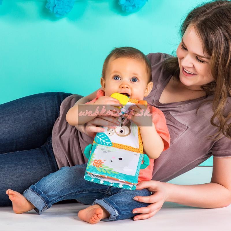 Textilná knižka je vhodná od 3 mesiacov. Na stránkách plných dobrodružstiev sú farebné obrázky a vzory, ktoré stimulujú zrak. Šustiace stránky a rôzné druhy materiálov lákajú dieťatko ku skúmaniu. Knižka má na ľavej strane zvlnenú hryzačku- držiak na na ktorej sú dva krúžky, ktoré po zatrasení hrkajú, zároveň pomáhajú pri prerezávaní zúbkov upokojiť ďasná.