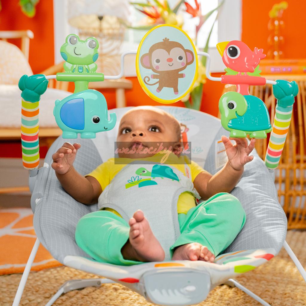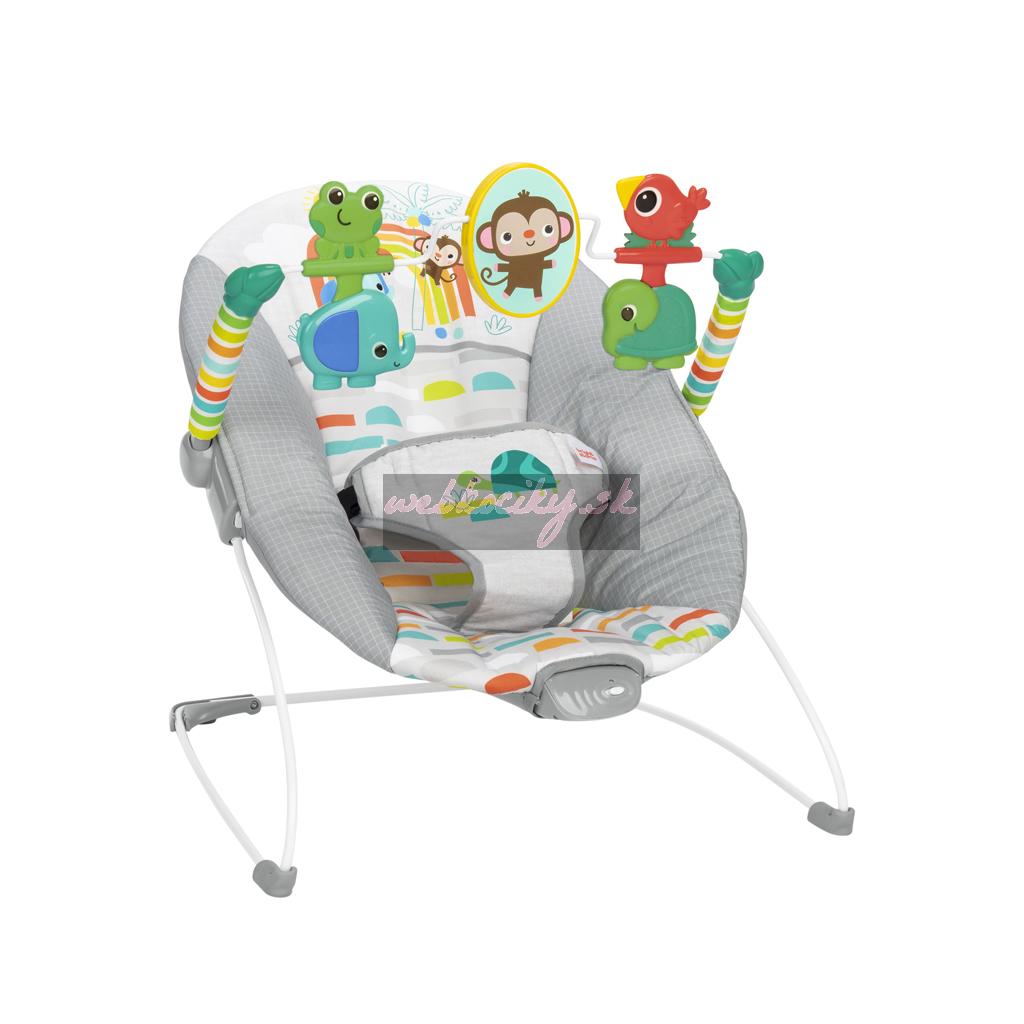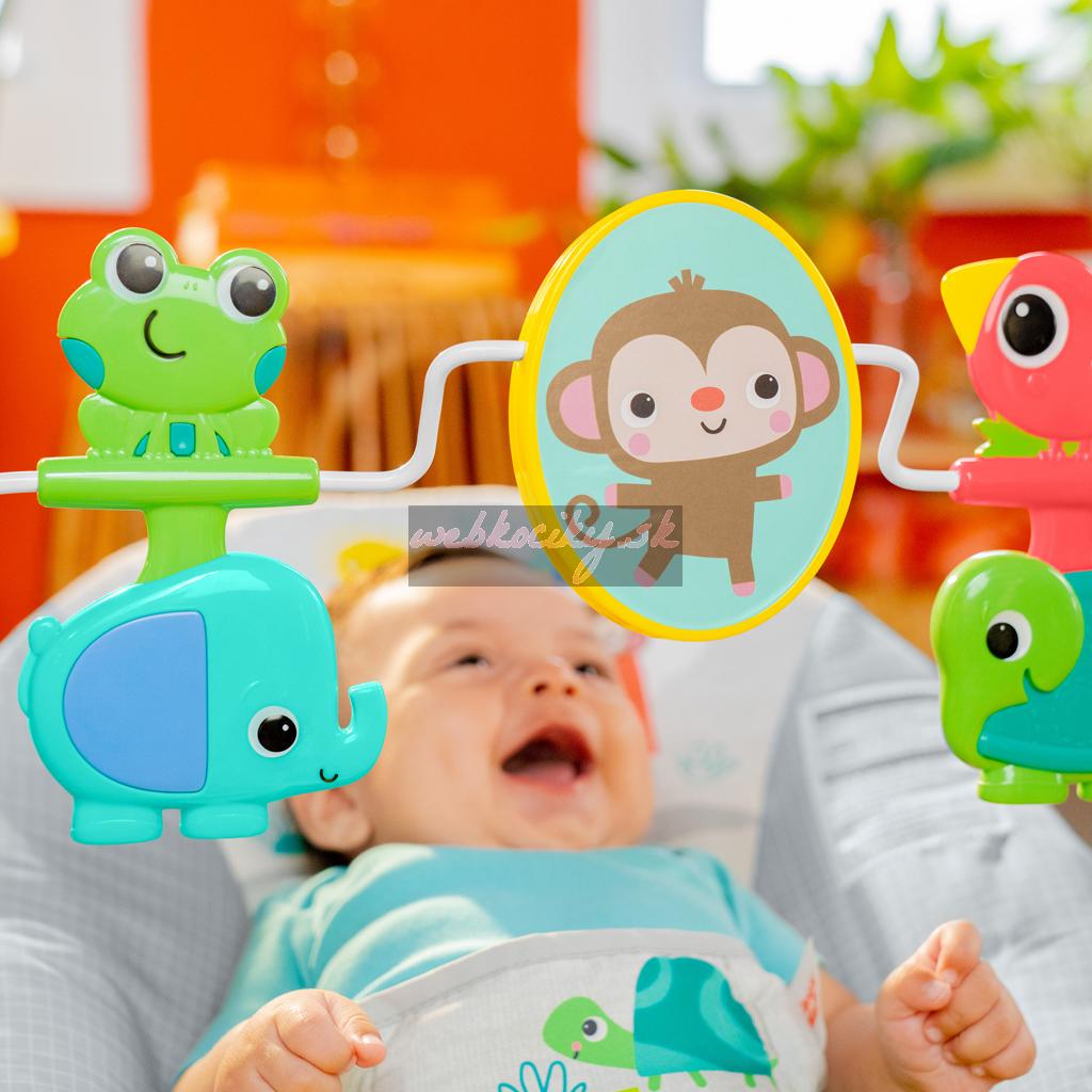 Toto pohupujúce lehátko pomáha vášmu zvedavému dieťatku hrať sa a precvičovať motorické zručnosti. Nemotorná opička a priatelia vykúzlia Vášmu dieťatku úsmev na perách. Môže sa natiahnuť k netopierovi a roztočiť hračky visiace zhora. Na druhej strane opičky je zrkadielko bezpečné pre detičky slúžiace na predstavenie vlastného odrazu.
