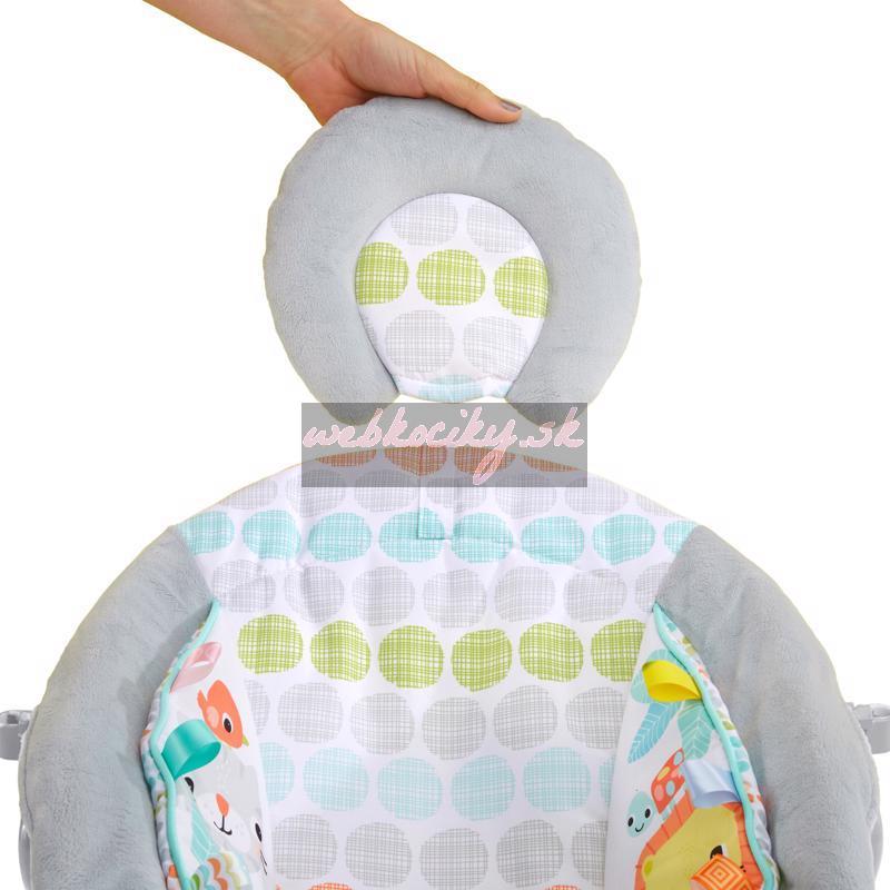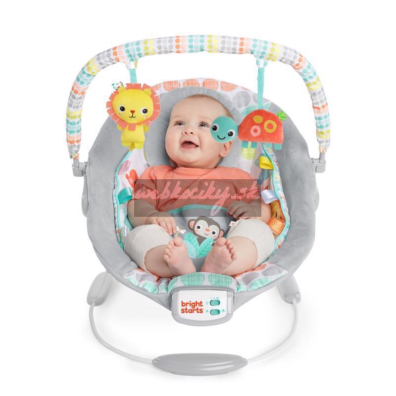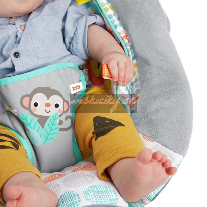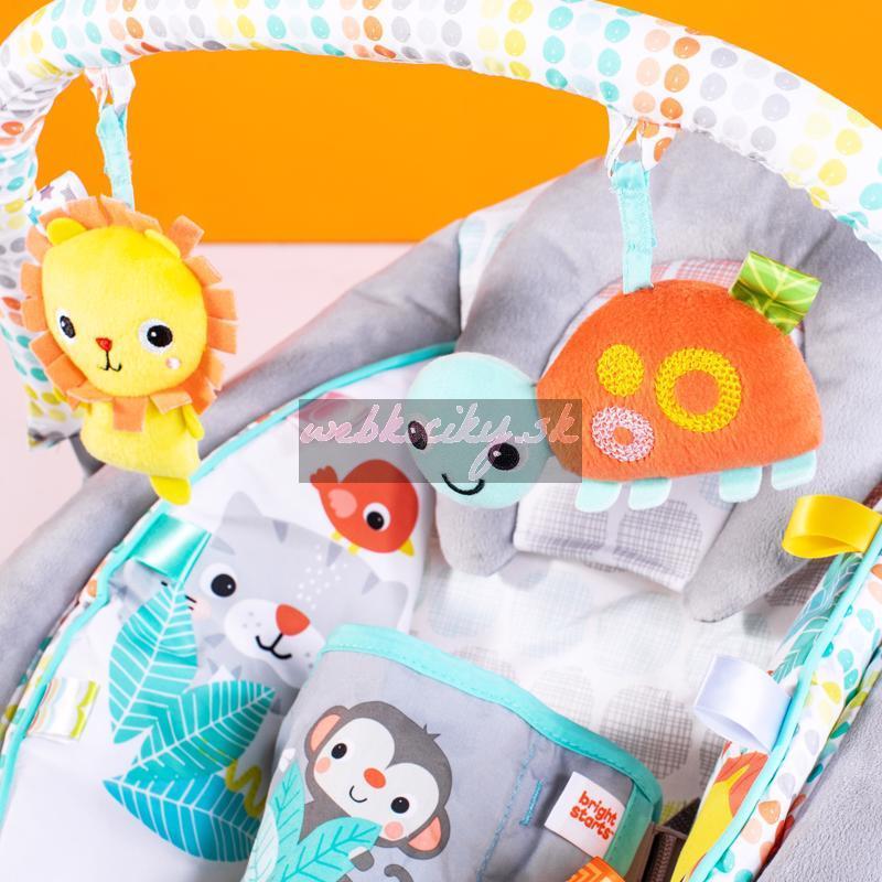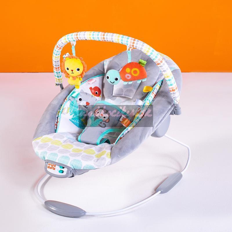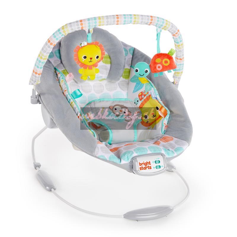 Lehátko Whimsical Wild od Bright Starts bude rozveseľovať bábätko v jednom kuse. Pohodlná sedacia časť poskytuje perfektné pohodlie a podporu s upokojujúcimi vibráciami, plyšovými tkaninami, integrovanou novorodeneckou vložkou a odnímateľnou opierkou hlavy. Farebné a pútavé postavičky robia toto lehátko zábavným.