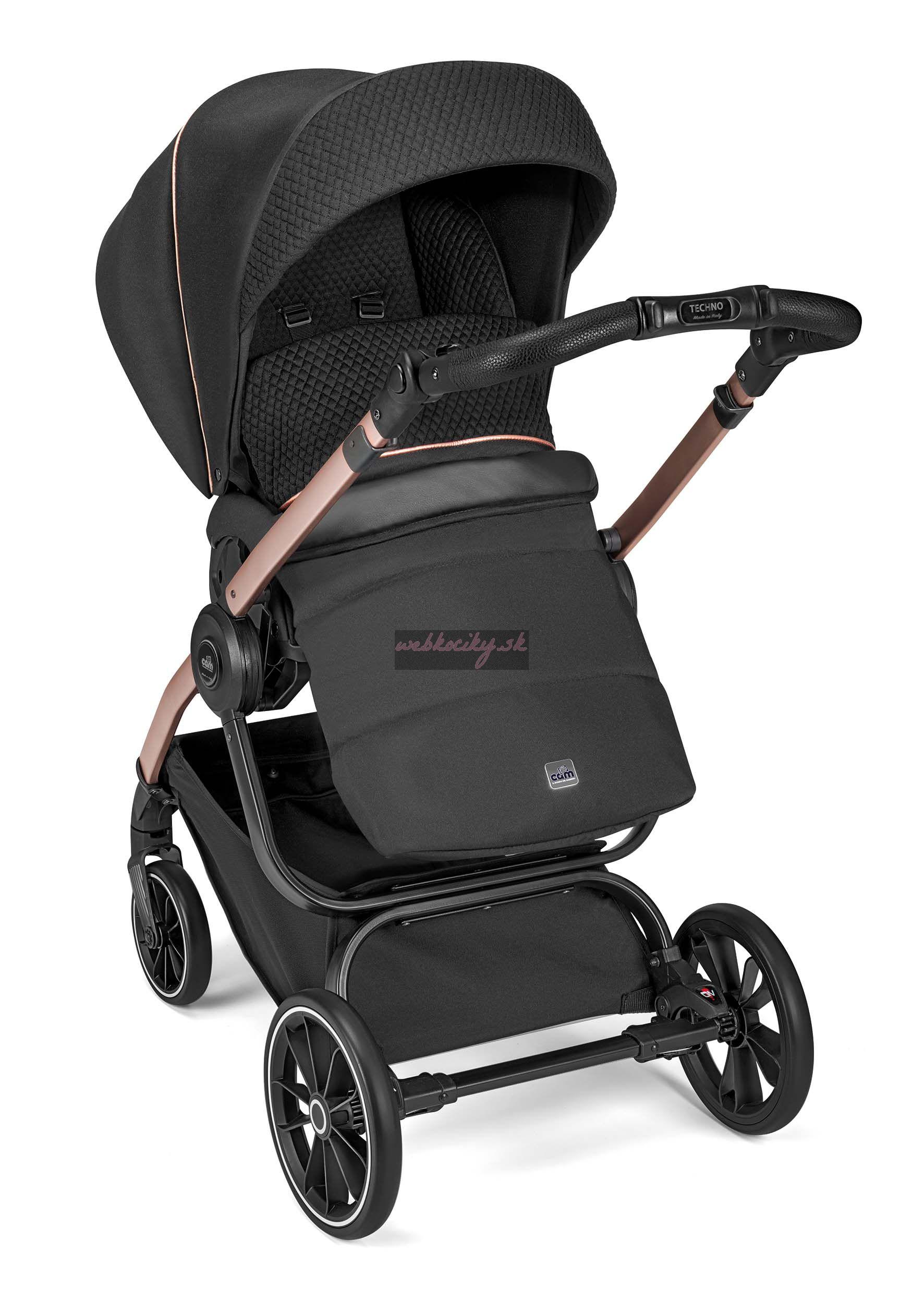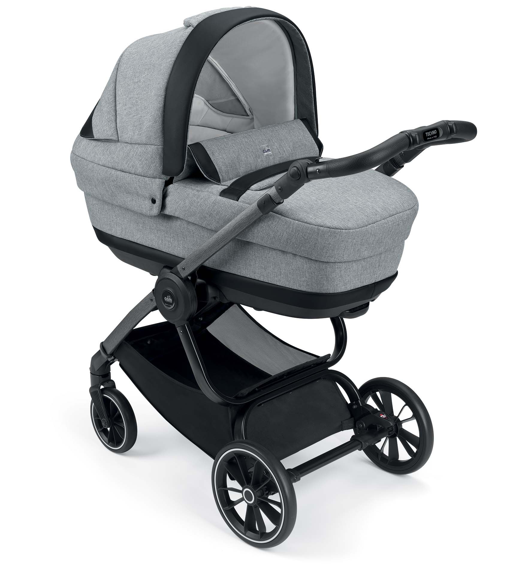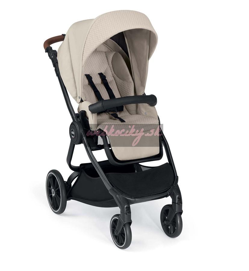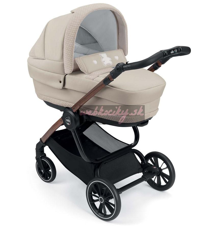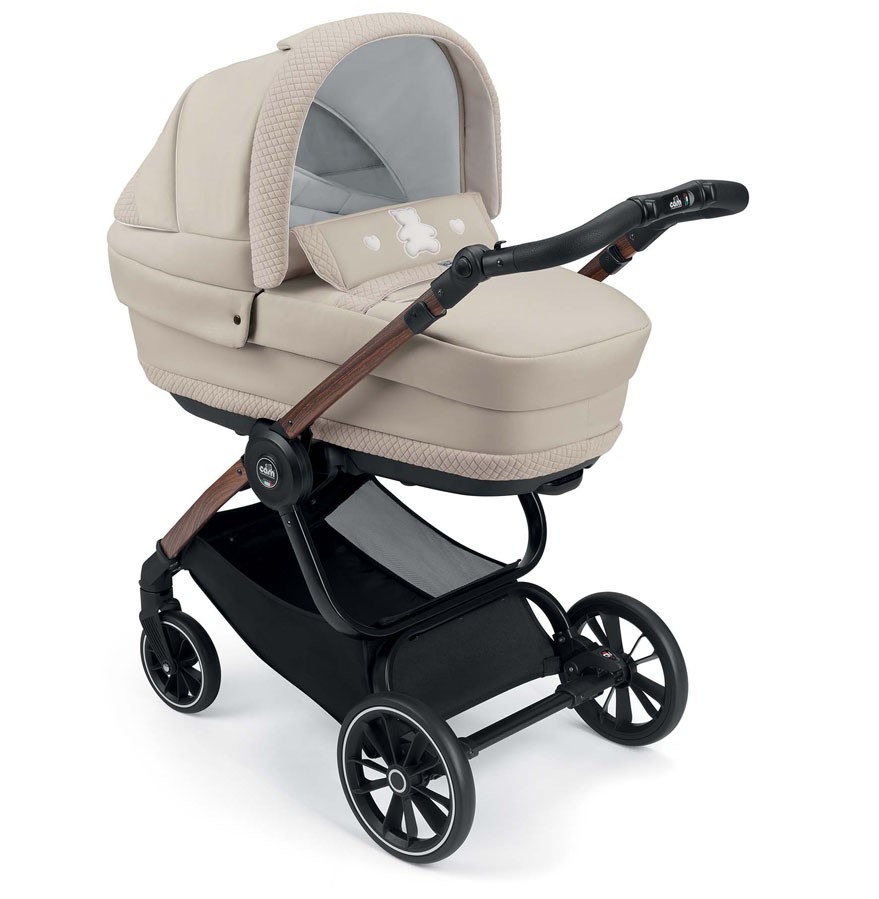 Podvozok ku kočíku je dodávaný v troch farebných variantoch: BIANCO Carbonia, NERO Carbonia a ALLMINIO spazzolato. Výškovo nastaviteľná rukoväť s detailom ručného prešívanie v eko koži. Odpružená kolesá s guličkovými ložiskami. Priestranný nákupný košík. Jednoduché skladanie podvozku a kompaktné rozmery pri zložení uľahčí manipuláciu.