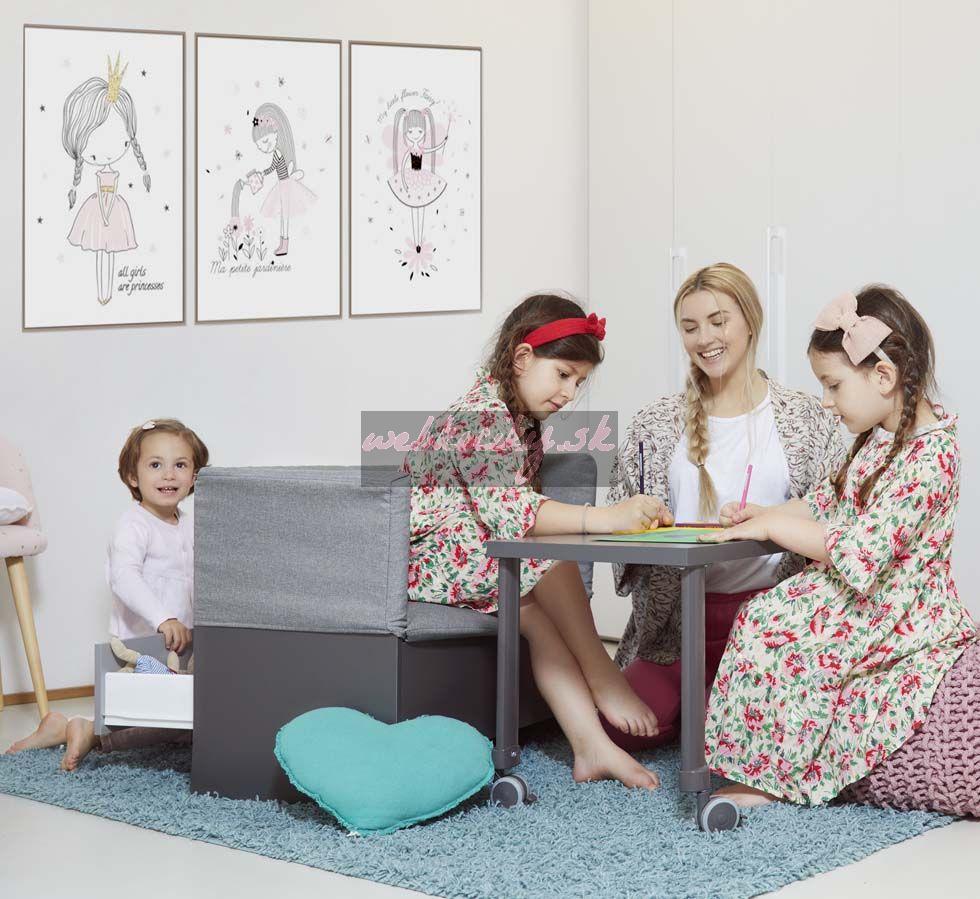 Stylová přebalovací komoda pro děti od narození do 11 kg a praktická pohovka se stolkem pro děti do 14 let v jednom.