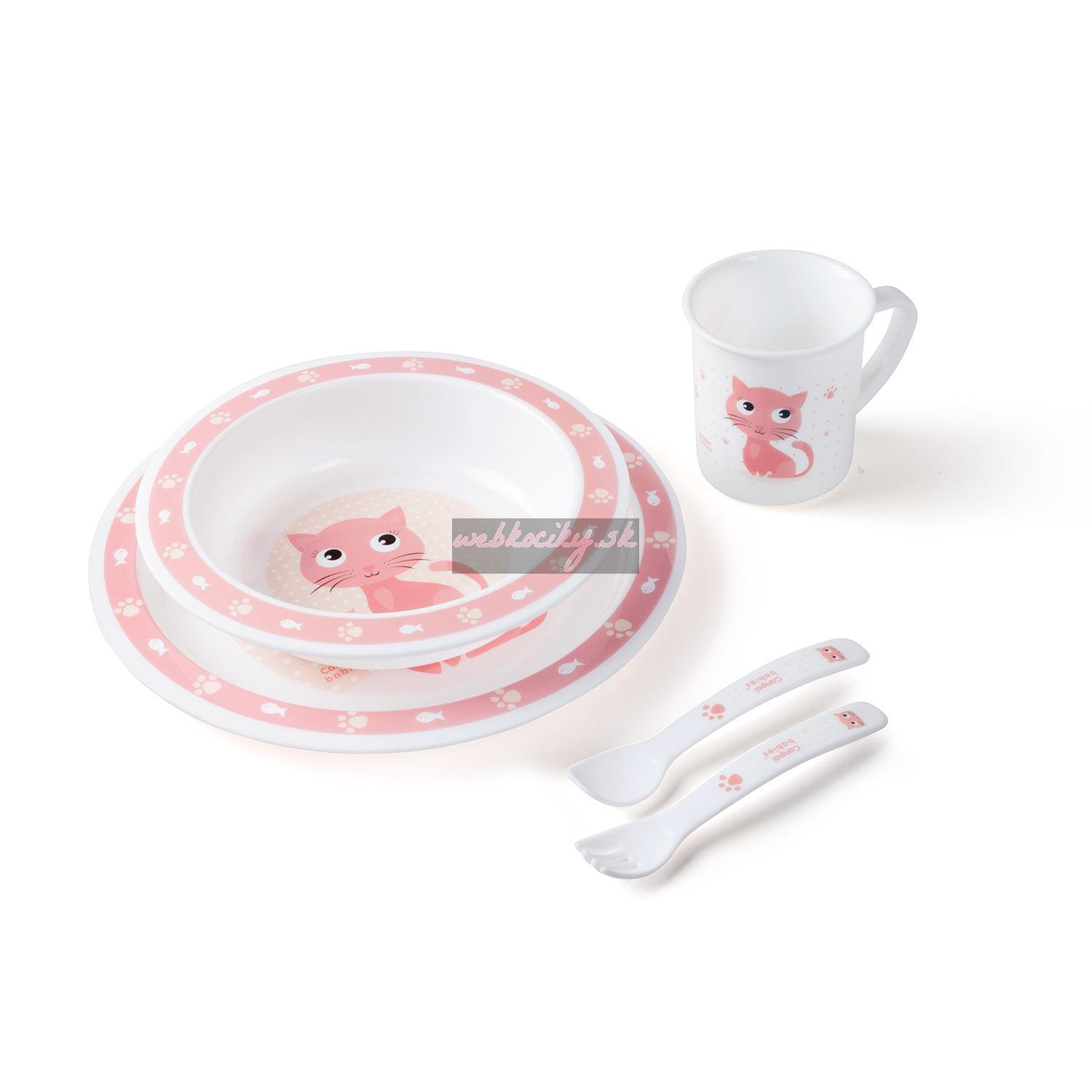 Plastová sada riadu je určená deťom starším ako jeden rok. Živé farby robia pre každé dieťa jedlo oveľa zaujímavejšie. Sada obsahuje misku, tanier, hrnček a príbor. Udržujte v čistote. Pred prvým a každým ďalším použitím dôkladne umyte v teplej vode s prípravkom určeným deťom, prelejte vriacou vodou. Nesterilizujte, neprevárajte! Vždy skontrolujte teplotu podávaného pokrmu. Možno používať v mikrovlnej rúre. Neodporúčame umývanie v umývačke riadu. Bez BPA.