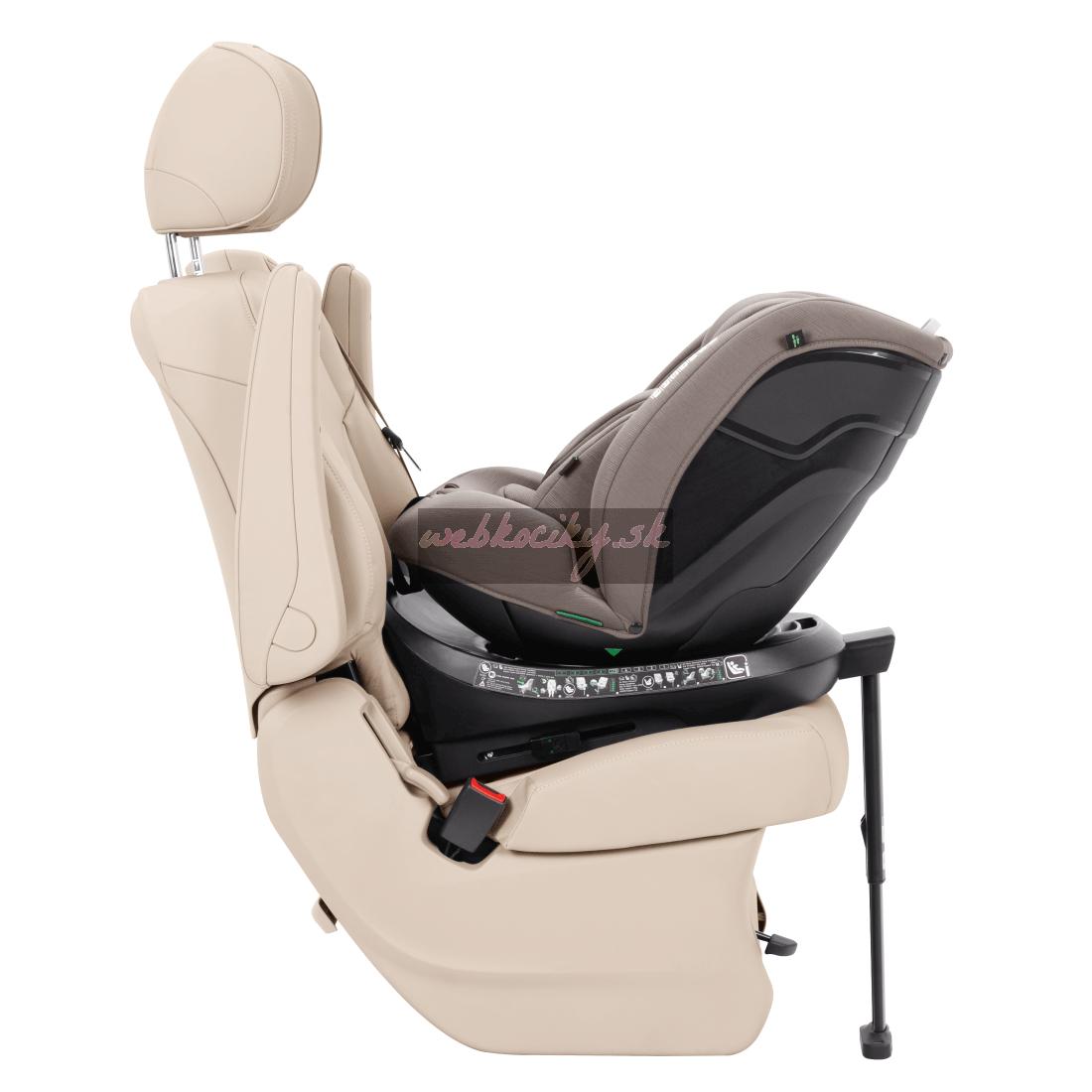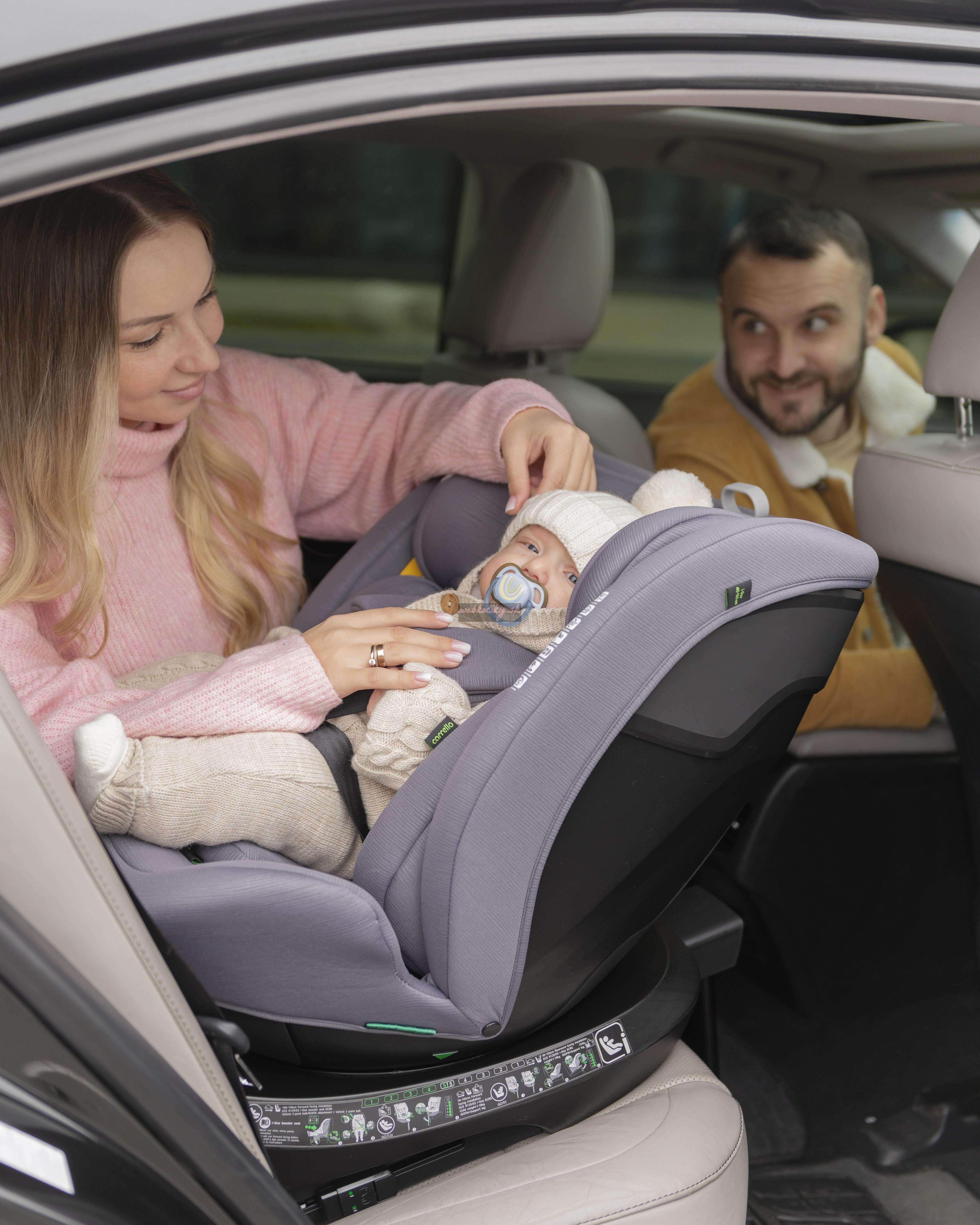 Možnosť otáčania sedačky o 360 stupňov umožňuje rodičom pohodlne usadiť a pripútať dieťa, zatiaľ čo nastaviteľná výška opierky hlavy a uhol sklonu sedadla umožňujú prispôsobenie podľa rastu dieťaťa. Nastaviteľný bezpečnostný pás, ramenné vypchávky s protišmykovým povrchom a vodidlá pásov zaisťujú bezpečnú a pohodlnú cestu.