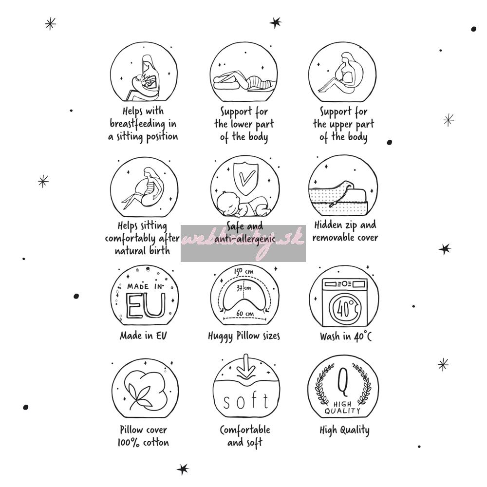 - Vankúš Huggy pomáha v čase odpočinku a pri spaní s veľkým bruškom. Keď už je dieťatko na svete, uľahčí kŕmenie, uľaví chrbtu a umožňuje zaujať pohodlnú pozíciu pri dojčení.