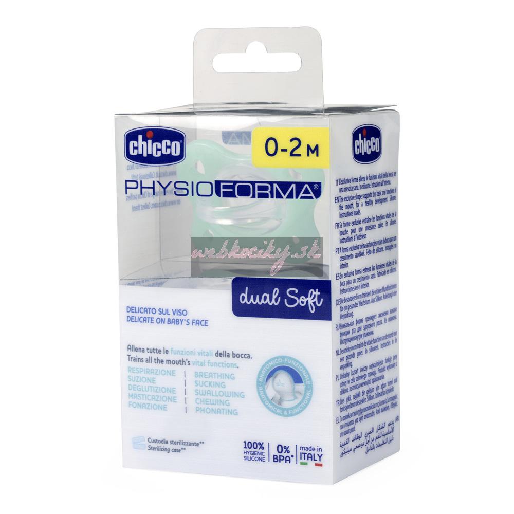 Všetky cumlíky Chicco sú PhysioForma: PhysioForma je anatomický a funkčný dizajn cumlíkov Chicco, ktorý podporuje a správne stimuluje funkcie úst a zároveň zachováva fyziologickú polohu jazyka.