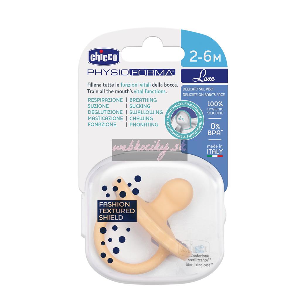 Cumlík Chicco Physio Luxe rady Physioforma patrí medzi aktívne ortodontické upokojujúce cumlíky. Štít cumlíka bol špeciálne navrhnutý tak, aby čo najmenšou možnou styčnou plochou s detskou tváričkou poskytol aj tej najcitlivejšej pokožke so sklonom k podráždeniu maximálny komfort. Dotýka sa okolia úst len v štyroch malých bodoch! Svojim jedinečným ergonomickým tvarom cumlík prirodzene podporuje správne fyziologické dýchanie novorodencov. Napomáha polohe jazyka smerom na podnebie, teda smerom dopredu a hore, a tak učí dieťatko dýchať správne nosom už od narodenia. Okrem toho tento anatomický cumlík podporuje správny vývoj čeľuste. Nesprávne dýchanie ústami totiž zvyšuje riziko SIDS, a tiež prispieva k nesprávnemu vývoju úst a sánky.