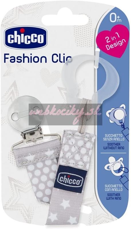 Univerzálny a módny klip Chicco Fashion je vhodný pre väčšinu cumlíkov. Vďaka nemu bude mať dieťatko aj vy svoj obľúbený cumlík vždy pri sebe a ostane tak dlhšie čistý. Potlač je obojstranná. Inovatívny dizajn umožňuje jednoduché pripevnenie na cumlíky. Na cumlíky s krúžkom ho jednoducho pripevníte pomocou šnúrky a cumlíky bez krúžka sa prichytia vďaka mäkkému krúžku na konci klipu.