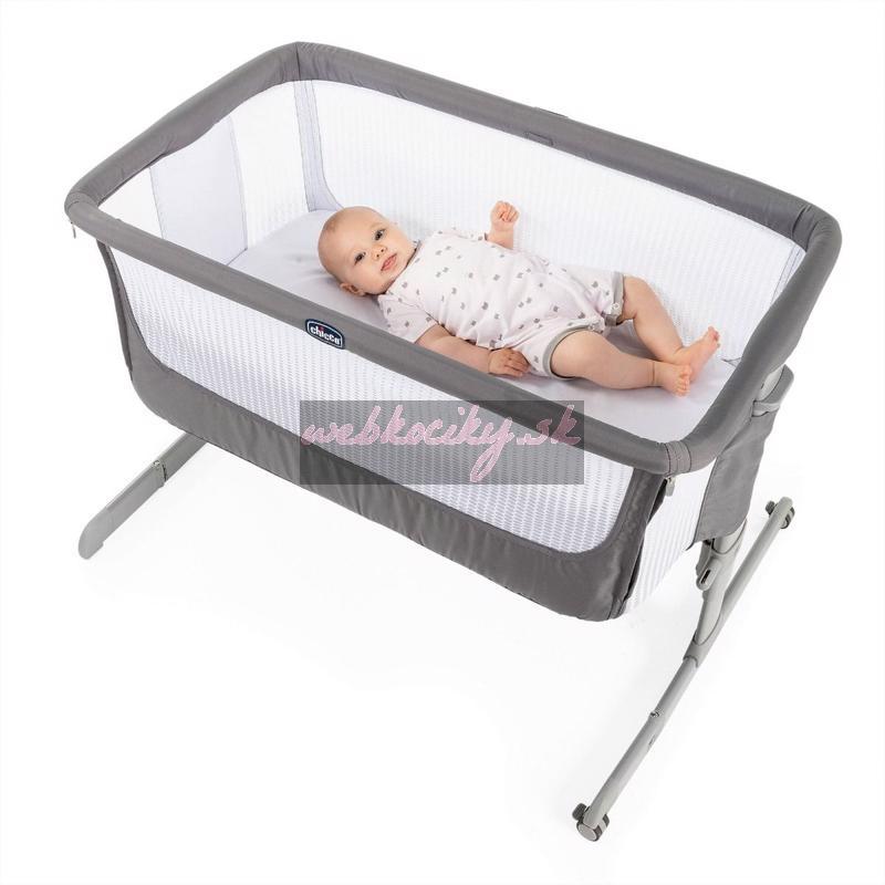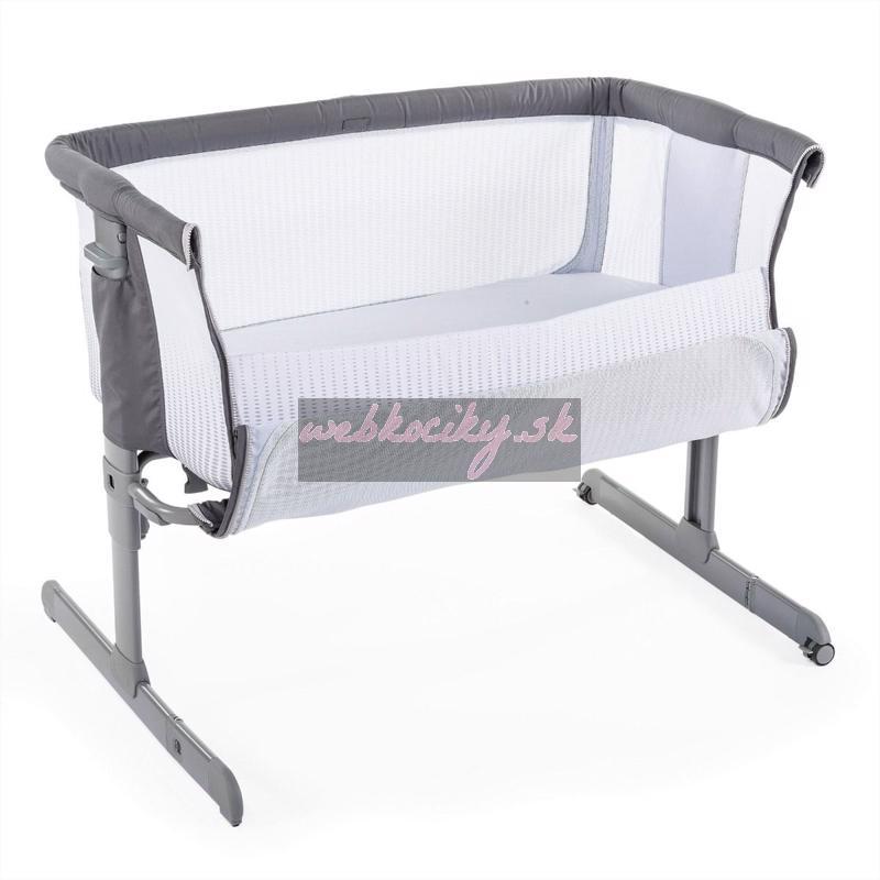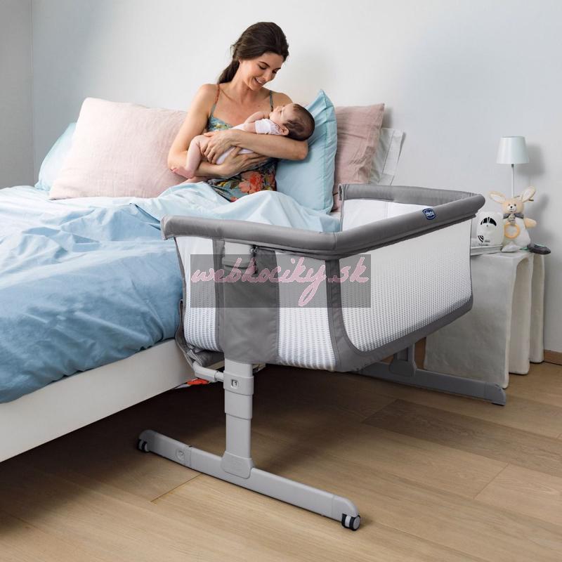 Next2Me je jedinečná výškovo nastaviteľná postieľka s odnímateľnou bočnicou, ktorú môžete pripojiť k svojej posteli a mať tak dieťa vždy nablízku bez potreby k nemu vstávať.