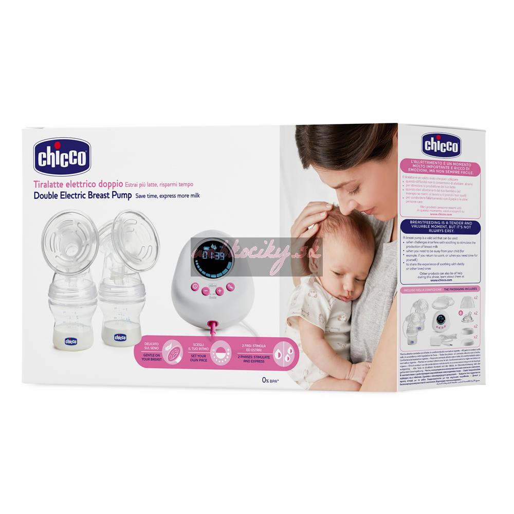 Dvojitá elektronická odsávačka Chicco je špeciálne navrhnutá tak, aby odsávala materské mlieko tak jemne, ako je to len možné, a zároveň maximálne efektívne, z oboch prsníkov naraz. Možno ju používať so sieťovým adaptérom, ale aj ako prenosnú odsávačku s alkalickými batériami typu AA.