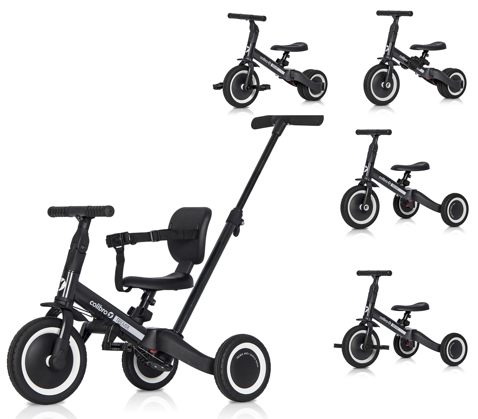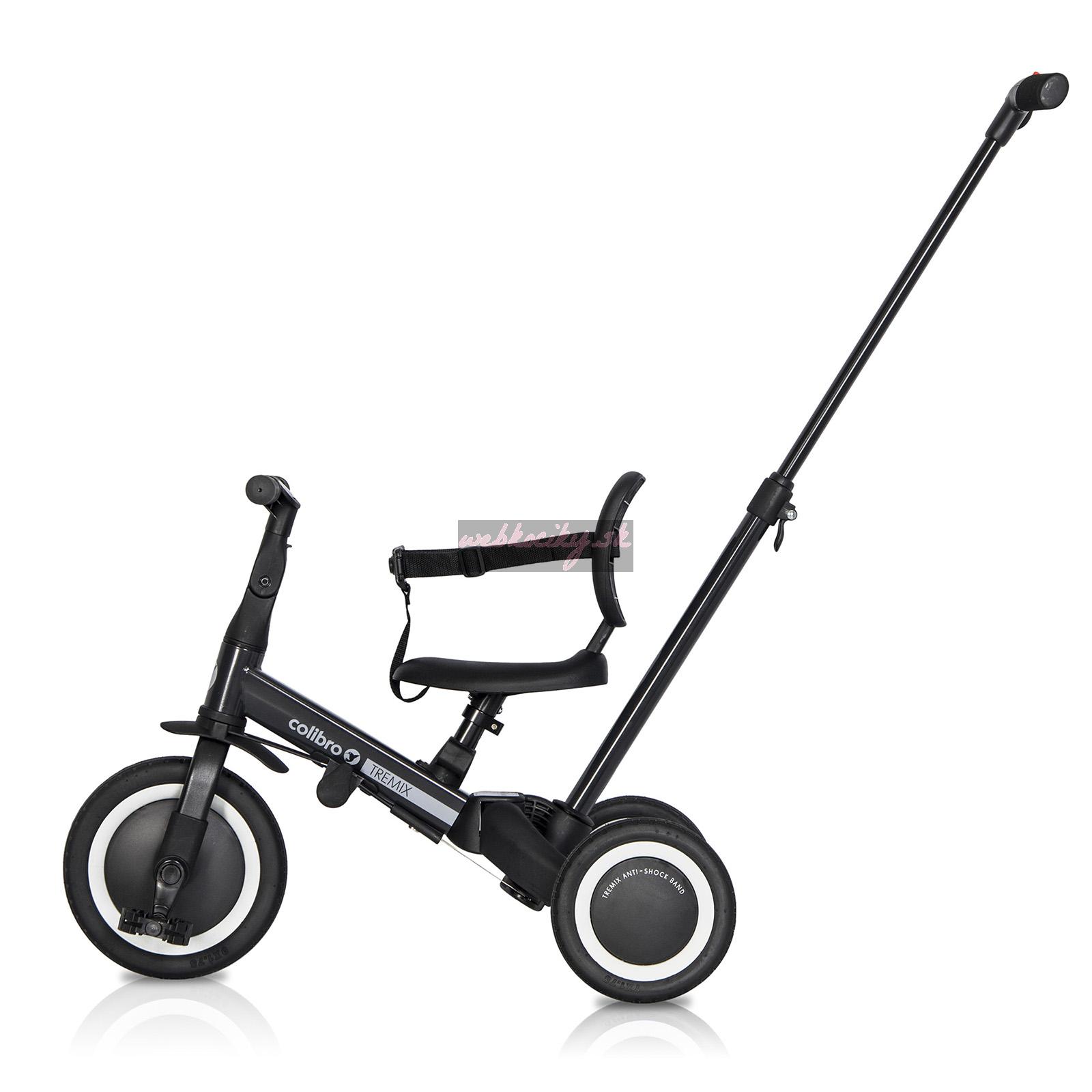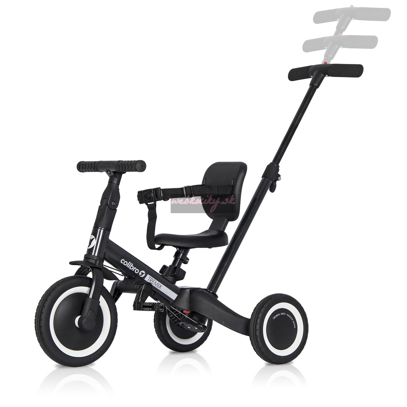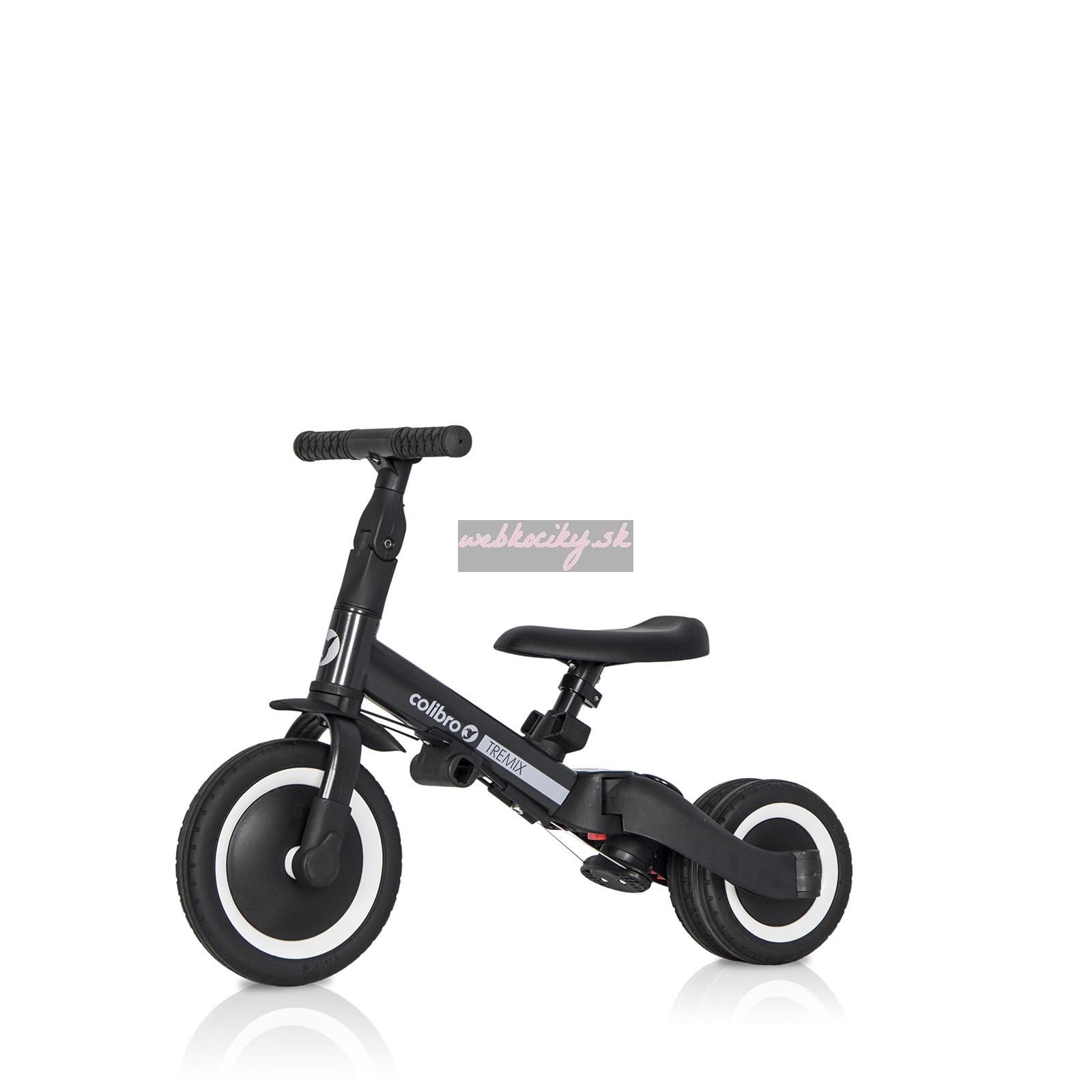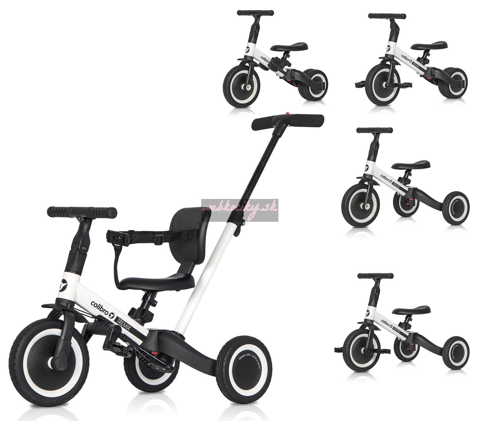 - Hlavné výhody bicykla 6-v-1 TREMIX UP od Colibro:- až 6 rôznych konfigurácií, ktoré vám umožnia používať bicykel dlhší čas,- jednoduchý systém transformácie bicykla a jeho prispôsobenia bez použitia nástrojov podľa veku dieťaťa, - gumové pneumatiky s behúňom zaisťujúcim vynikajúcu priľnavosť (Dávajte si pozor na podobné výrobky s kolesami z peny EVA, ktorá neposkytuje priľnavosť na mokrom a klzkom povrchu!), - gumové protišmykové držadlá na riadidlách, - pevná konštrukcia ktorý môže ľahko vydržať hmotnosť aj 5 -ročného dieťaťa, - rukoväť na tlačenie pre rodiča s 3 -stupňovým nastavením výšky, - športový dizajn, - perfektný darček pre každú príležitosť, - mäkké čalúnené sedadlo s odnímateľným operadlom a bezpečnostnými pásmi,