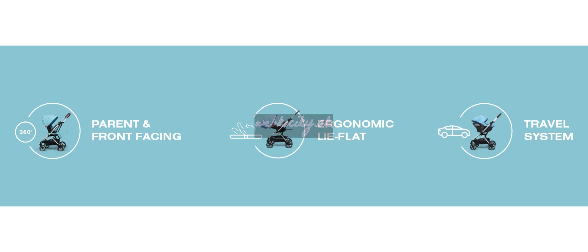 - Sedenie kočíka spoločne s integrovanou opierkou nôh možno jednou rukou rýchlo a jednoducho otočiť o 360 ° a dáva tak vášmu dieťaťu možnosť voľby medzi jazdou po či proti smeru jazdy.