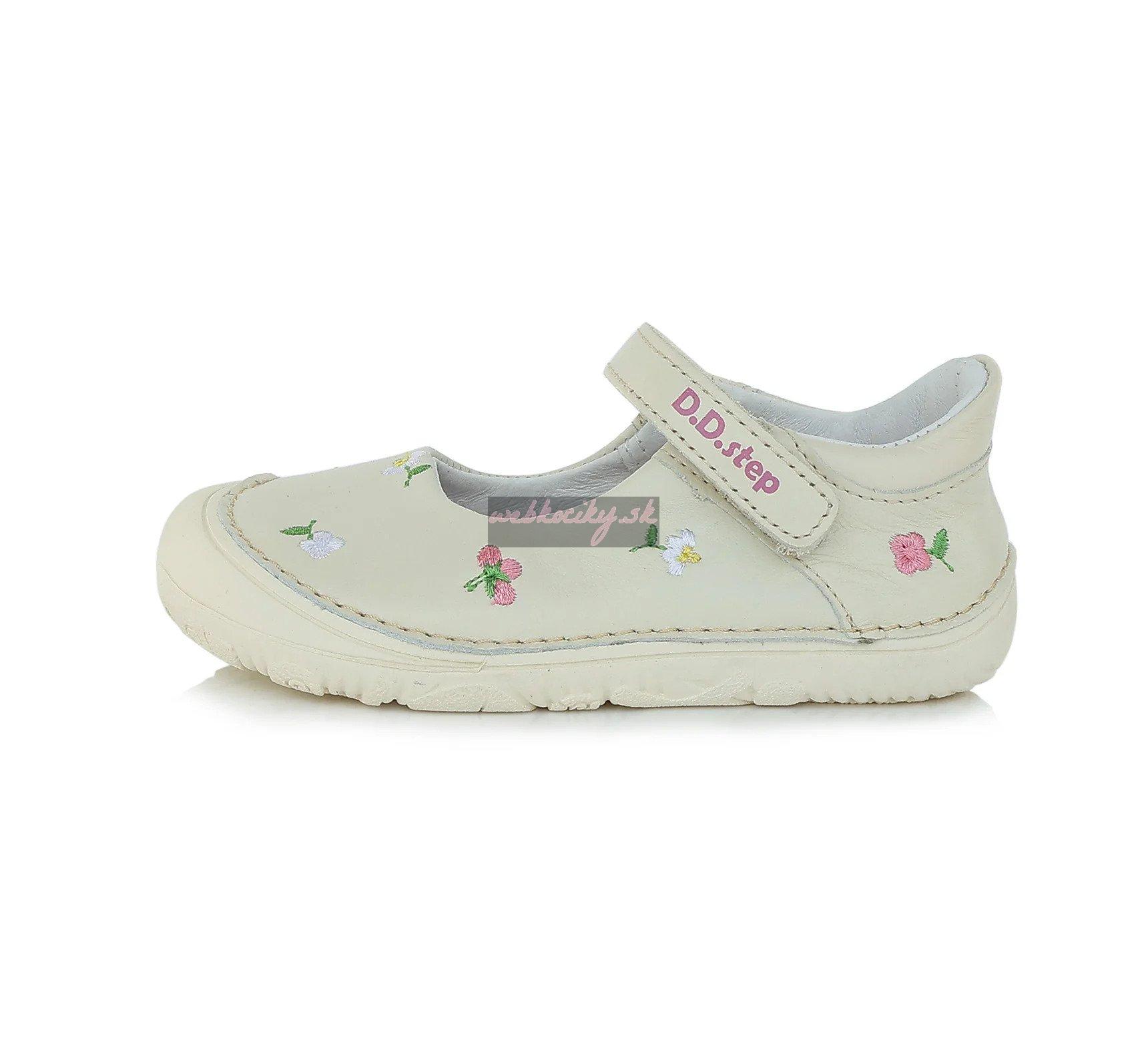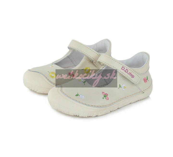 Kožené balerínky z letnej barefoot kolekcie DD Step. Majú širokú špičku, päta je nespevnená, okolo členku sú polstrované. Dodávané s vyberateľnou rovnou stielkou bez podpory klenby. Topánky majú nulový drop a mimoriadne flexibilnú podrážku s označením 073.