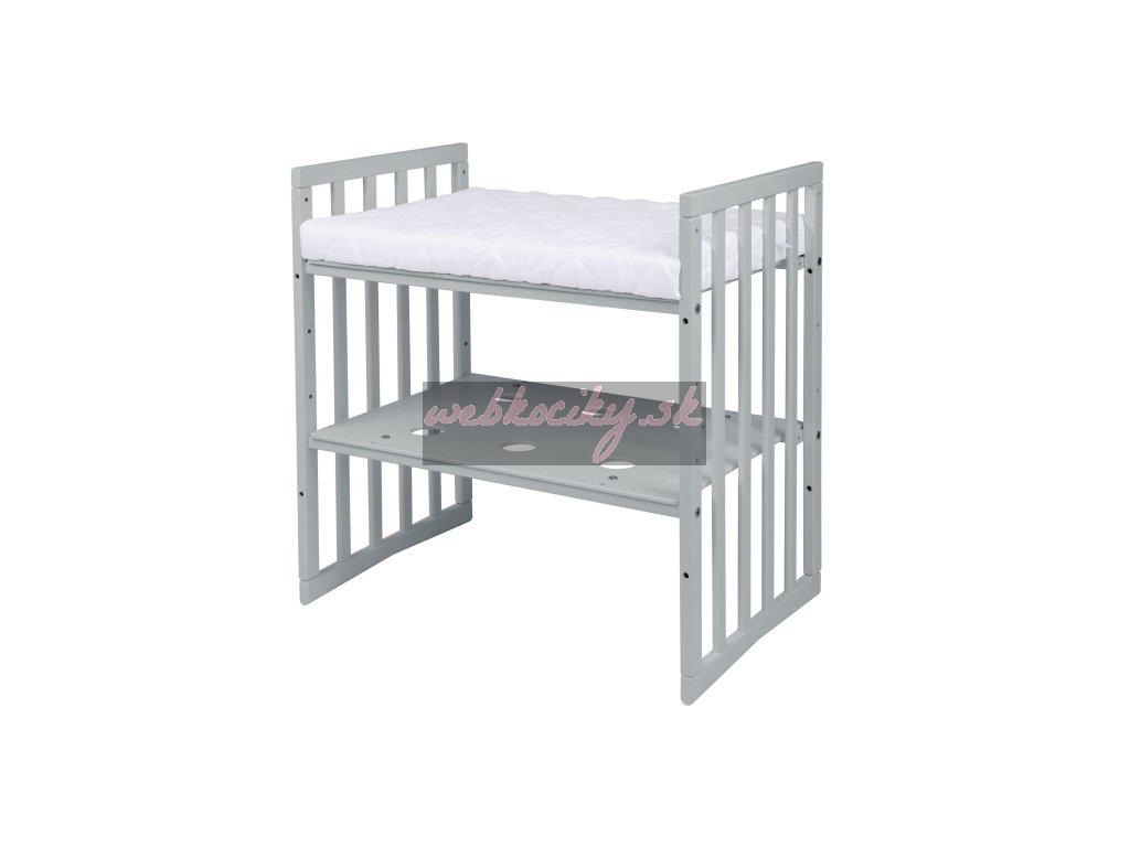 2. skrinku s dvomi poličkami (stredná časť postieľky), ktorá môže v čase využívania mini postieľky v najmenšom tvare slúžiť na ukladanie detských vecí, prípadne ako prebalovací pult.