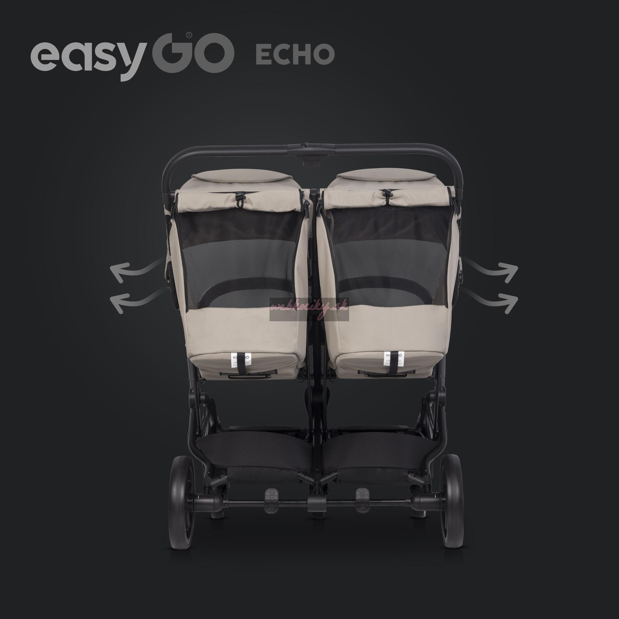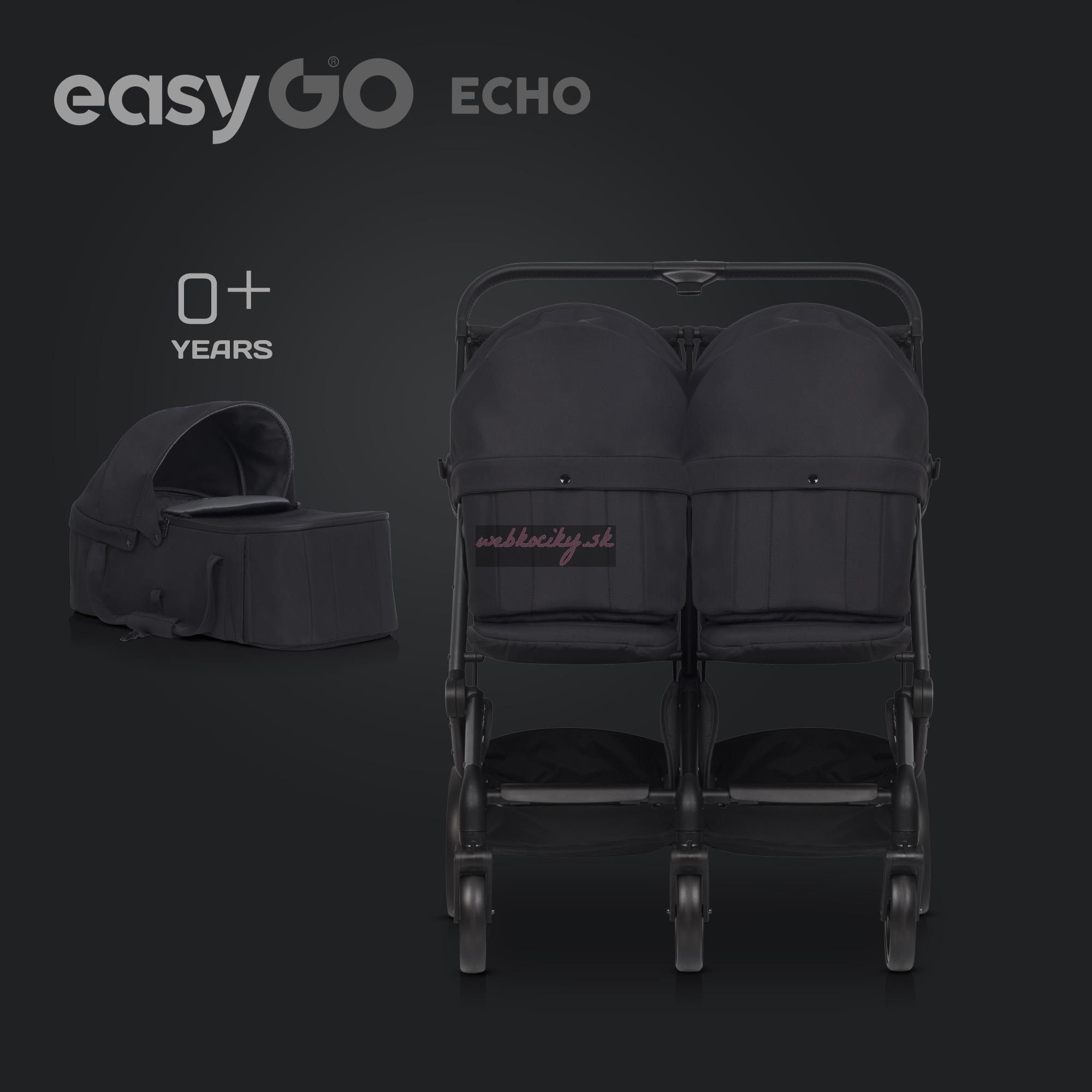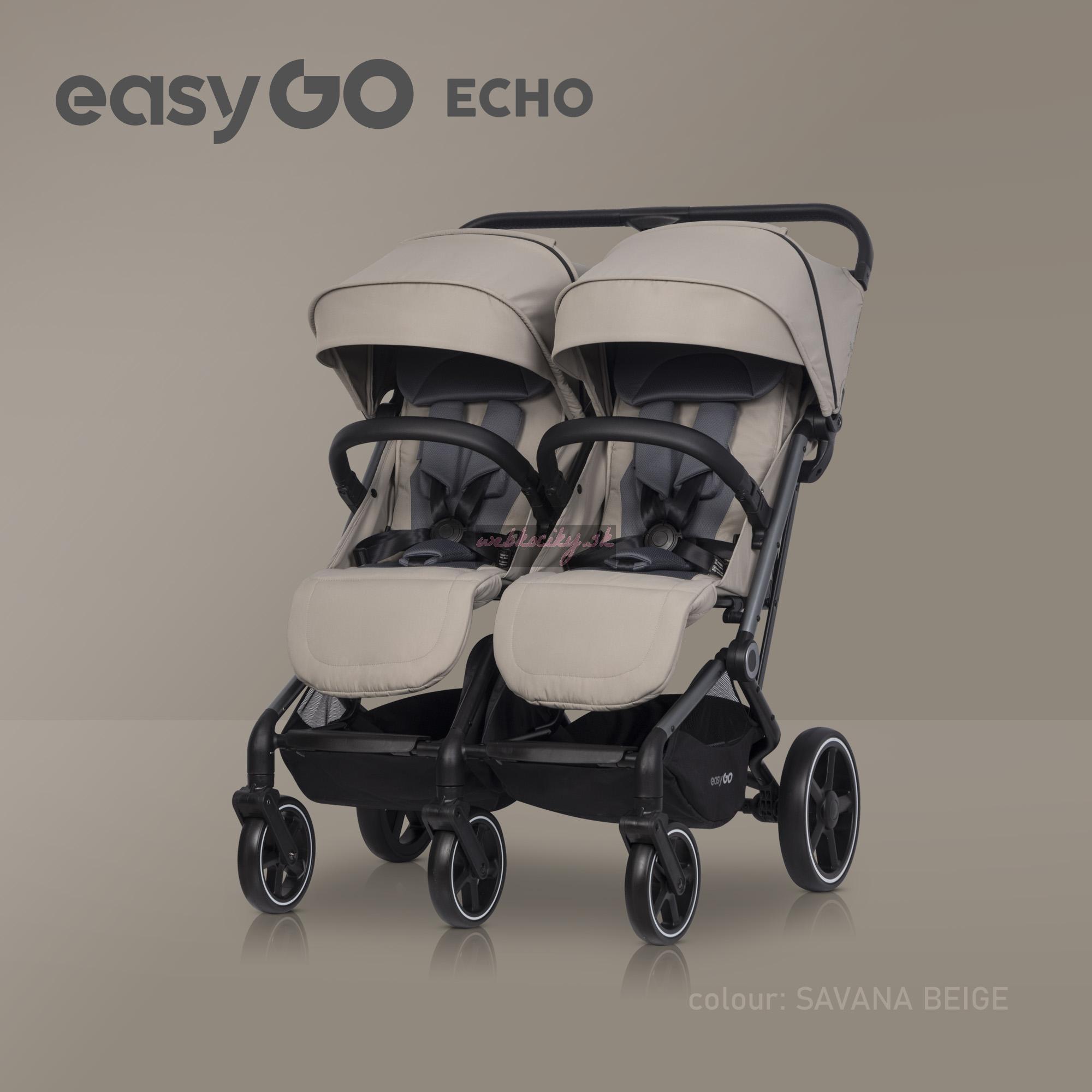 Značka EASYGO je už viac ako 15 rokov rok čo rok popredným výrobcom kočíkov pre dvojičky a deti. Naše skúsenosti sa premietajú do vytvárania stále lepších a lepších kočíkov pre vaše deti. Navrhnúť dobrý kočík pre dve deti nie je ľahká úloha, pretože musíte skĺbiť pohodlie detí s rozmermi a hmotnosťou kočíka, vďaka ktorému sa bude pohodlne jazdiť a prechádzať cez štandardné dvere doma, v obchode alebo vo výťahu. Tak vznikol kočík EASYGO ECHO - spojenie pohodlia detí s pohodlím rodičov.
