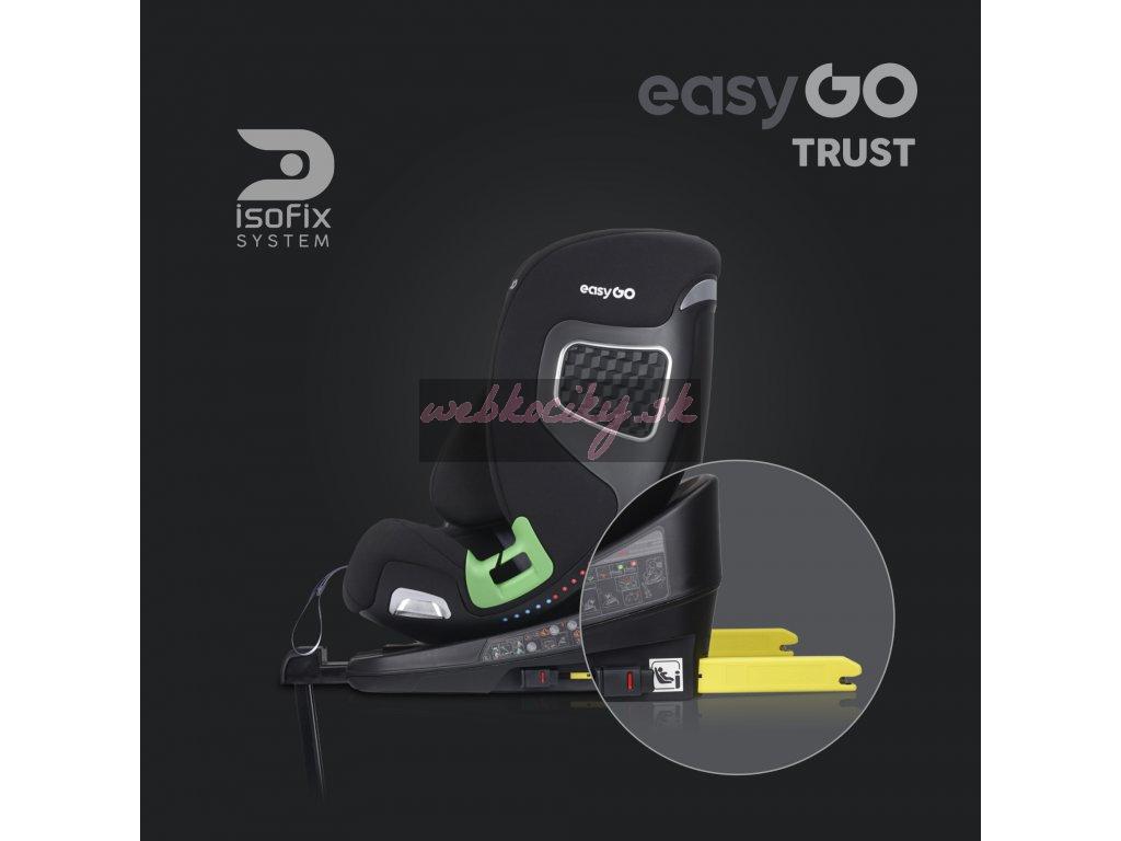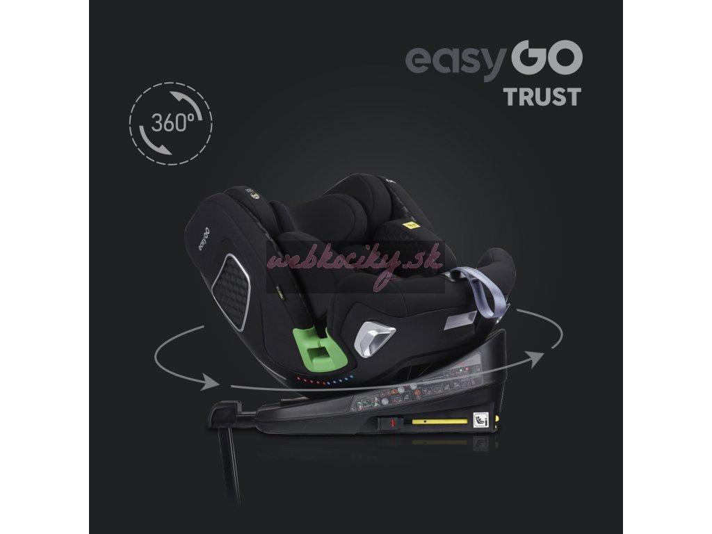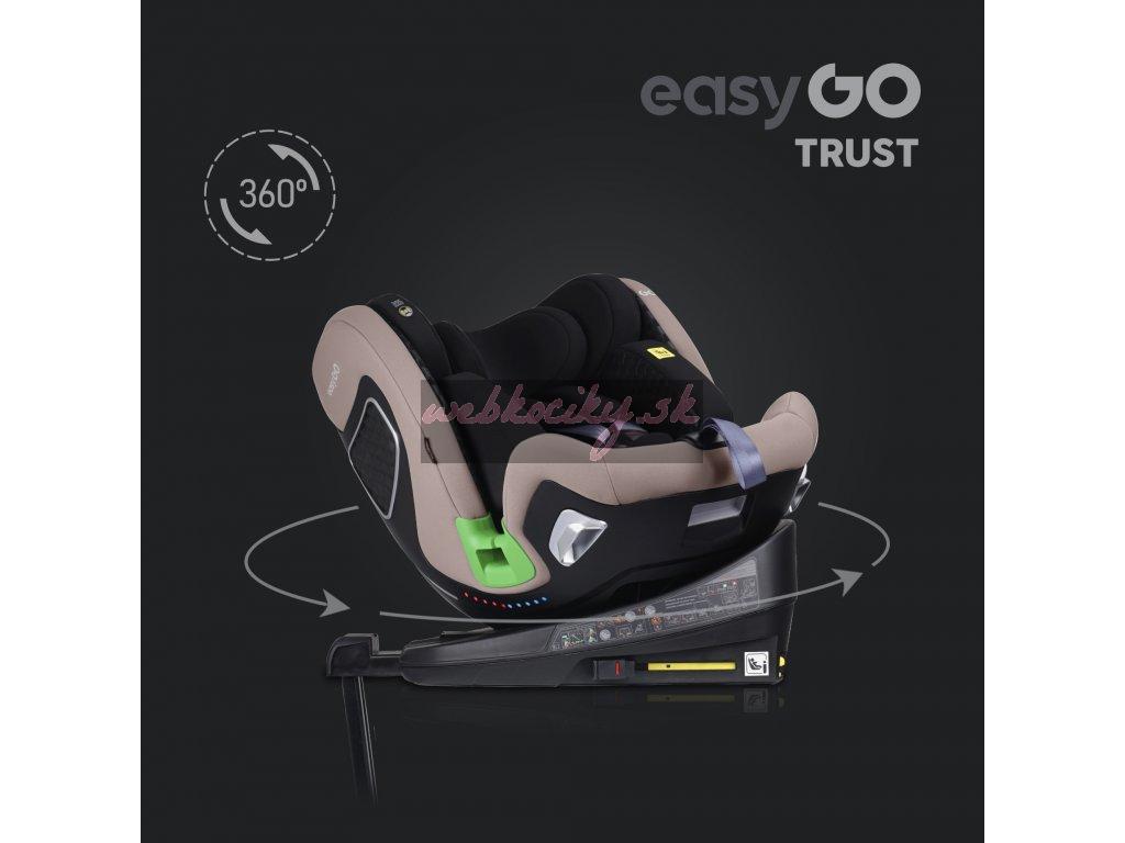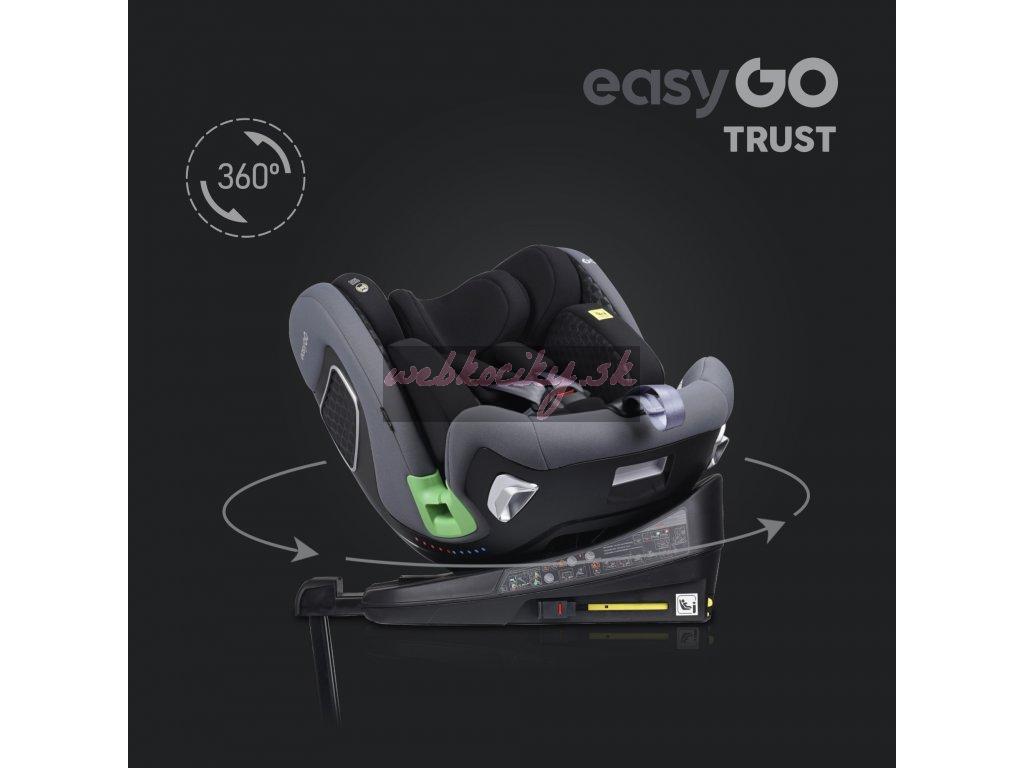 TRUST je otočná sedačka, ktorá umožňuje nielen jej otočenie vzad alebo vpred bez toho, aby ste ju museli dávať dole zo základne, ale tiež umožňuje polohovanie sedačky do strán. Táto funkcia je mimoriadne užitočná pri umiestňovaní dieťaťa do autosedačky alebo napríklad v stoji pri spoločnom kŕmení či hre. Pre väčšie pohodlie má sedačka TRUST 2 otočné páčky, jednu na každej strane. Umiestnenie pák po stranách sedadla uľahčuje otáčanie bez ohľadu na to, na ktorej strane pohovky je inštalované. RWF do 18 kg znamená, že sedačku TRUST je možné používať chrbtom k smeru jazdy pre deti do 18 kg (5 bodové pásy sú testované do 18kjg dieťaťa). Crash testy dokazujú, že sa jedná o najbezpečnejšiu polohu na prepravu detí a v tejto polohe sa odporúča používať sedačku čo najdlhšie. Polstrovanie autosedačky je rovnako dôležité ako jej konštrukcia. Je neoddeliteľnou súčasťou ovplyvňujúcou bezpečnosť dieťaťa. EASYGO TRUST má systém vložiek "pamäťová pena" a čalúnenie vyrobené z najkvalitnejšej odvetrávanej tkaniny.
