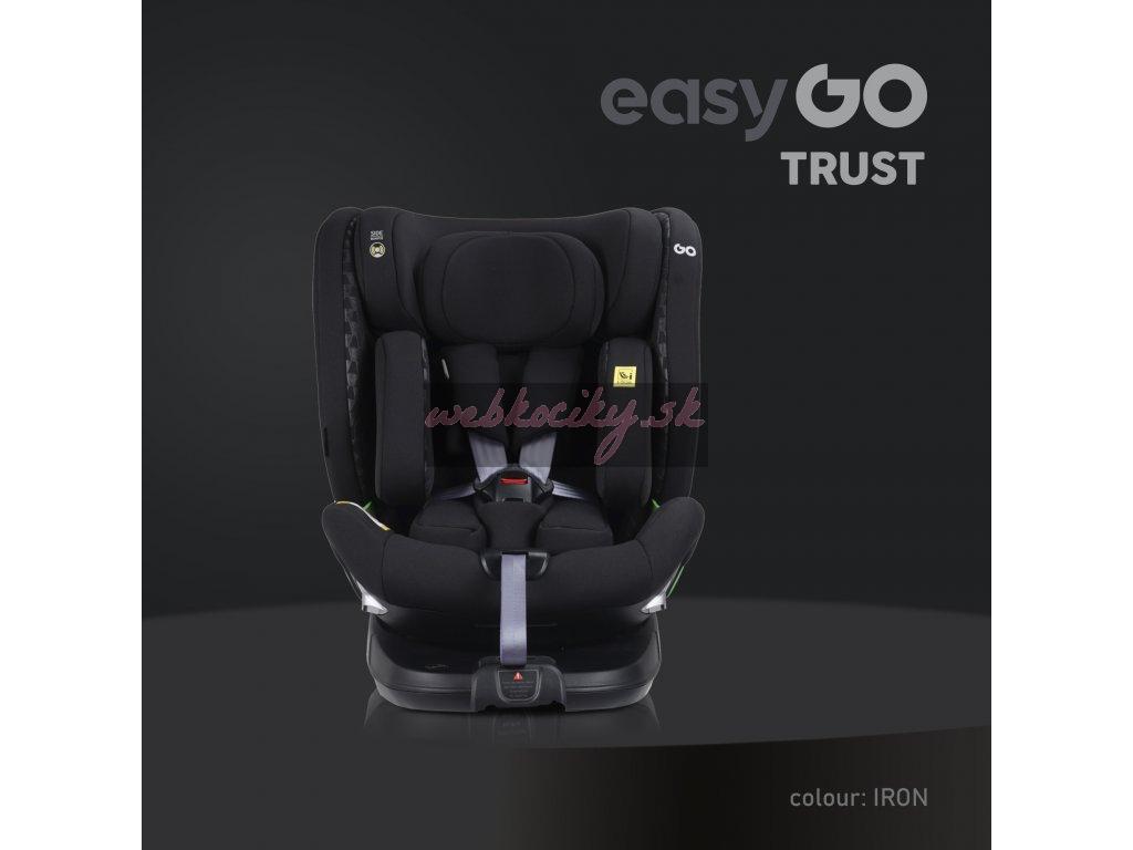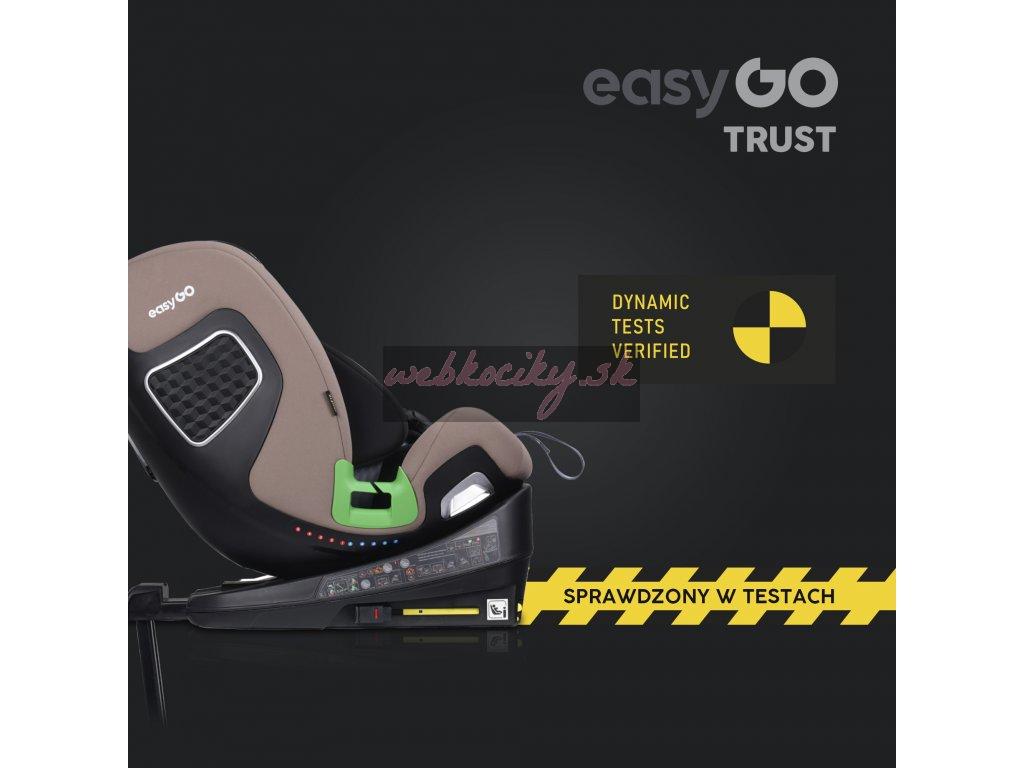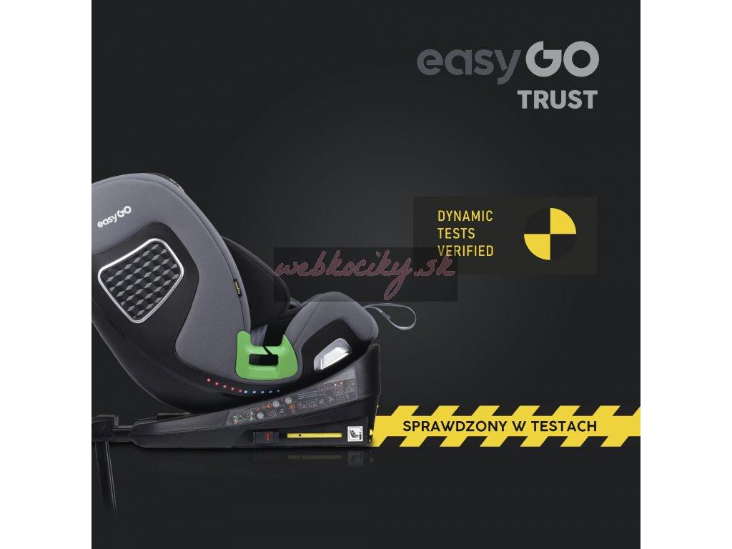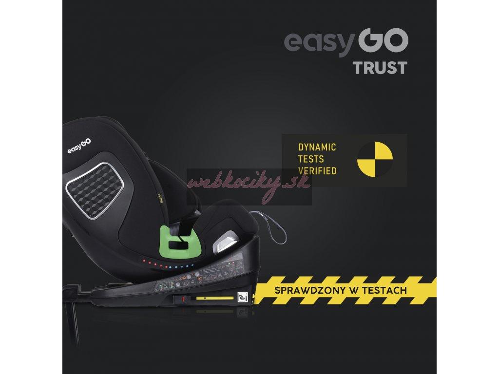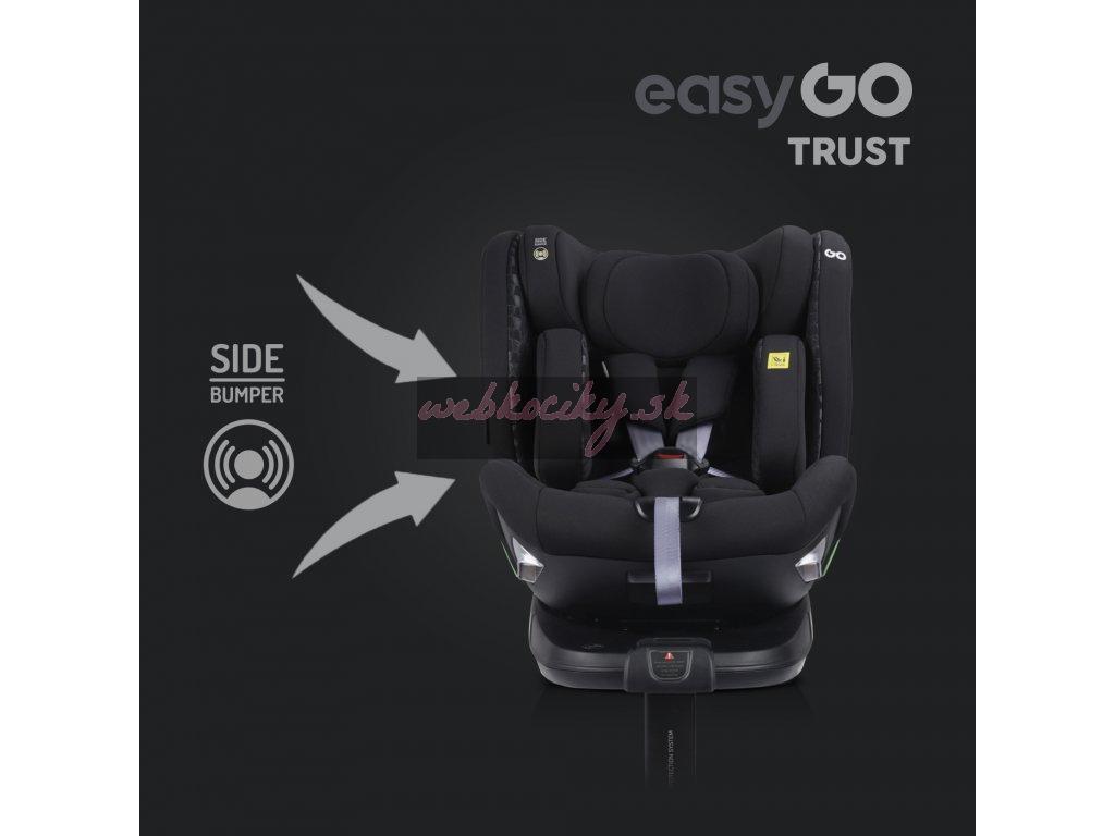 TRUST je otočná sedačka, ktorá umožňuje nielen jej otočenie vzad alebo vpred bez toho, aby ste ju museli dávať dole zo základne, ale tiež umožňuje polohovanie sedačky do strán. Táto funkcia je mimoriadne užitočná pri umiestňovaní dieťaťa do autosedačky alebo napríklad v stoji pri spoločnom kŕmení či hre. Pre väčšie pohodlie má sedačka TRUST 2 otočné páčky, jednu na každej strane. Umiestnenie pák po stranách sedadla uľahčuje otáčanie bez ohľadu na to, na ktorej strane pohovky je inštalované. RWF do 18 kg znamená, že sedačku TRUST je možné používať chrbtom k smeru jazdy pre deti do 18 kg (5 bodové pásy sú testované do 18kjg dieťaťa). Crash testy dokazujú, že sa jedná o najbezpečnejšiu polohu na prepravu detí a v tejto polohe sa odporúča používať sedačku čo najdlhšie. Polstrovanie autosedačky je rovnako dôležité ako jej konštrukcia. Je neoddeliteľnou súčasťou ovplyvňujúcou bezpečnosť dieťaťa. EASYGO TRUST má systém vložiek "pamäťová pena" a čalúnenie vyrobené z najkvalitnejšej odvetrávanej tkaniny.