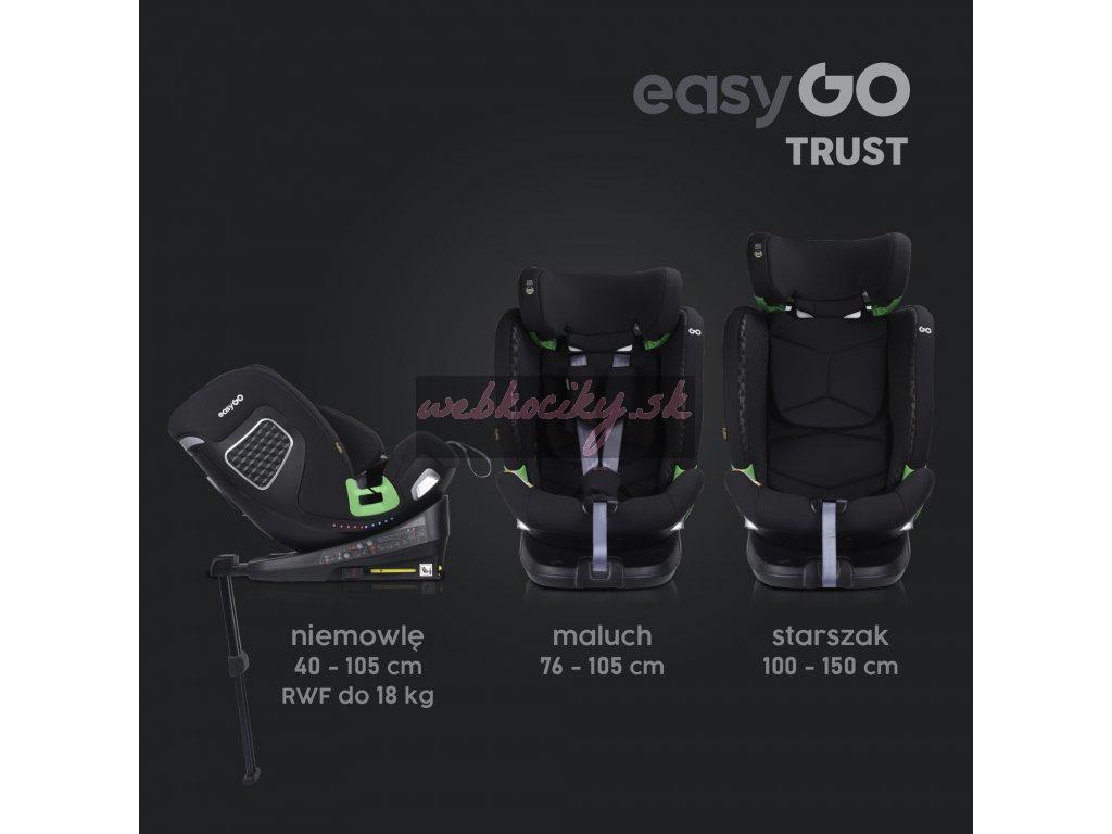 Autosedačka TRUST od EASYGO je produktom novej generácie. Autosedačka EASYGO TRUST je určená pre deti s výškou od 40 do 150 cm (podľa starého váhového kritéria je to ekvivalent autosedačky pre deti od narodenia do 36 kg). Tak veľké oddelenie bolo dosiahnuté vďaka technologicky vyspelým riešeniam, ako je výsuvný blok opornej nohy a možnosť úplne skryť nohu v základni. Ďalším riešením, ktoré umožňuje prepravu detí od narodenia v sedačke, je systém redukčných vložiek vyplnených „pamäťovou penou“.