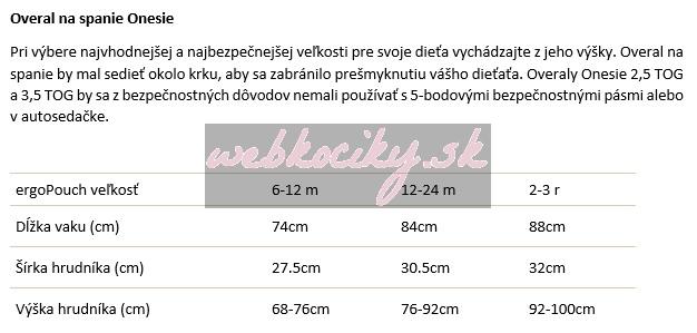 Overaly 2,5 TOG Onesie udržia deti počas spánku v teple pri izbových teplotách 17–23 °C. Hodnota TOG znamená, že pri používaní tohto výrobku nie sú potrebné ďalšie prikrývky v postieľke, čo z neho robí bezpečnú možnosť spánku.Rodičia sa môžu riadiť BEZPLATNÝM izbovým teplomerom a príručkou What to Wear (Čo si obliecť), ktoré sú súčasťou výrobku, a vhodne pod ne navrstviť prikrývku, aby bolo ich dieťaťu teplo.